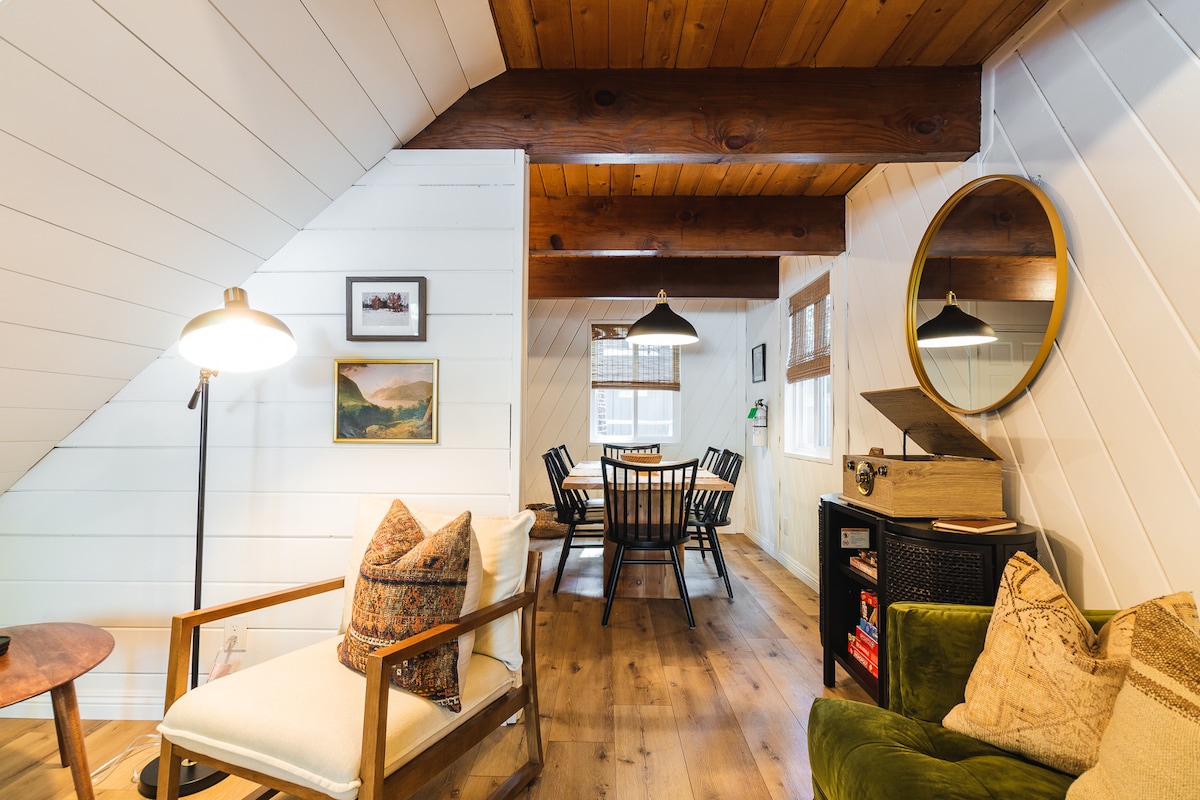 A cozy, mid-century A-frame nestled in a peaceful neighborhood on the north side of Big Bear Lake, but just minutes away from restaurants, shopping, skiing and more. • Panoramic views of both Bear Mountain and Snow Summit from the expansive deck • Quiet, family-friendly neighborhood • Just 3 houses in from the National Forest and miles of hiking trails • Perfect space for a romantic getaway or relaxing with family and friends • Mid-century modern decor • Efficient wood-burning stove