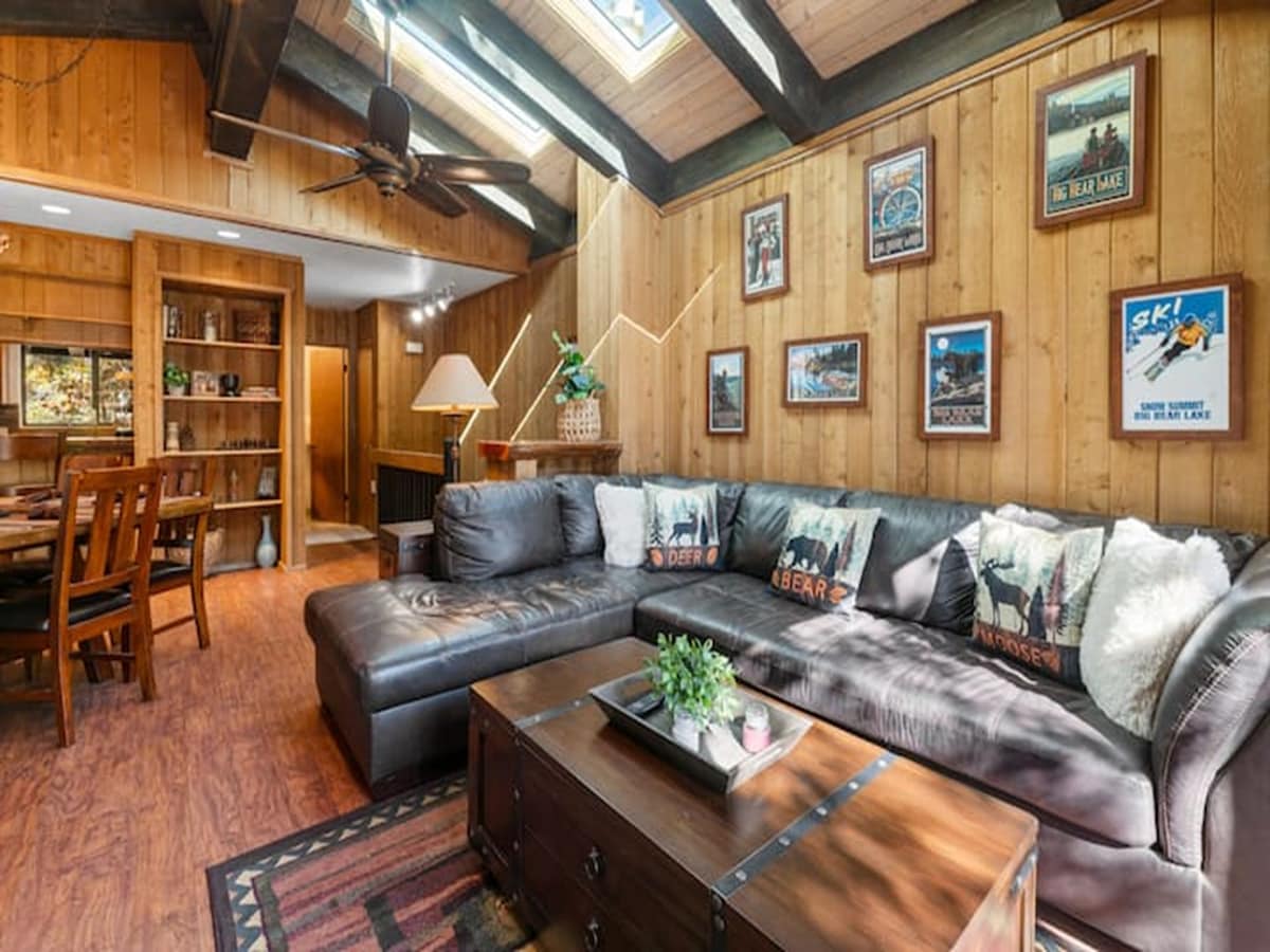 The Summit Chalet is a beautifully updated condo within walking distance of Snow Summit Ski Resort and a short drive to shopping and the Village. It features modern decor, a cozy living space with a wood-burning fireplace, a fully equipped kitchen, and spacious bedrooms. Enjoy outdoor dining on the deck with a charcoal barbecue. With amenities like laundry, multiple TVs, and convenient access to Big Bear, it's perfect for your mountain getaway.