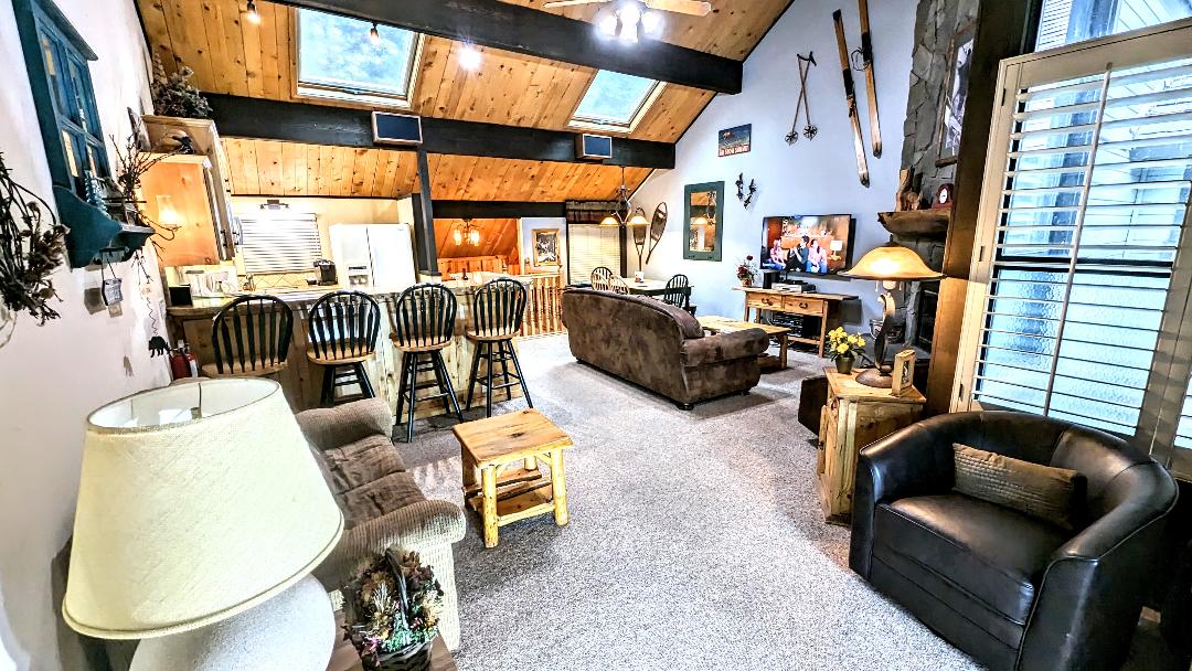Sunlight fills this lovely second floor cabin unit, setting the mood for a day in the mountains. With high vaulted ceilings it feels open while still feeling cozy. Best of all, just a few minutes walk to the chairlift at snow summit. Fire up the BBQ and relax with friends and family after a day on the slopes or exploring the Village. A full kitchen for all your cooking needs and a smart TV for movie night. Settle in amongst the comfy decor, you're at the cabin now.