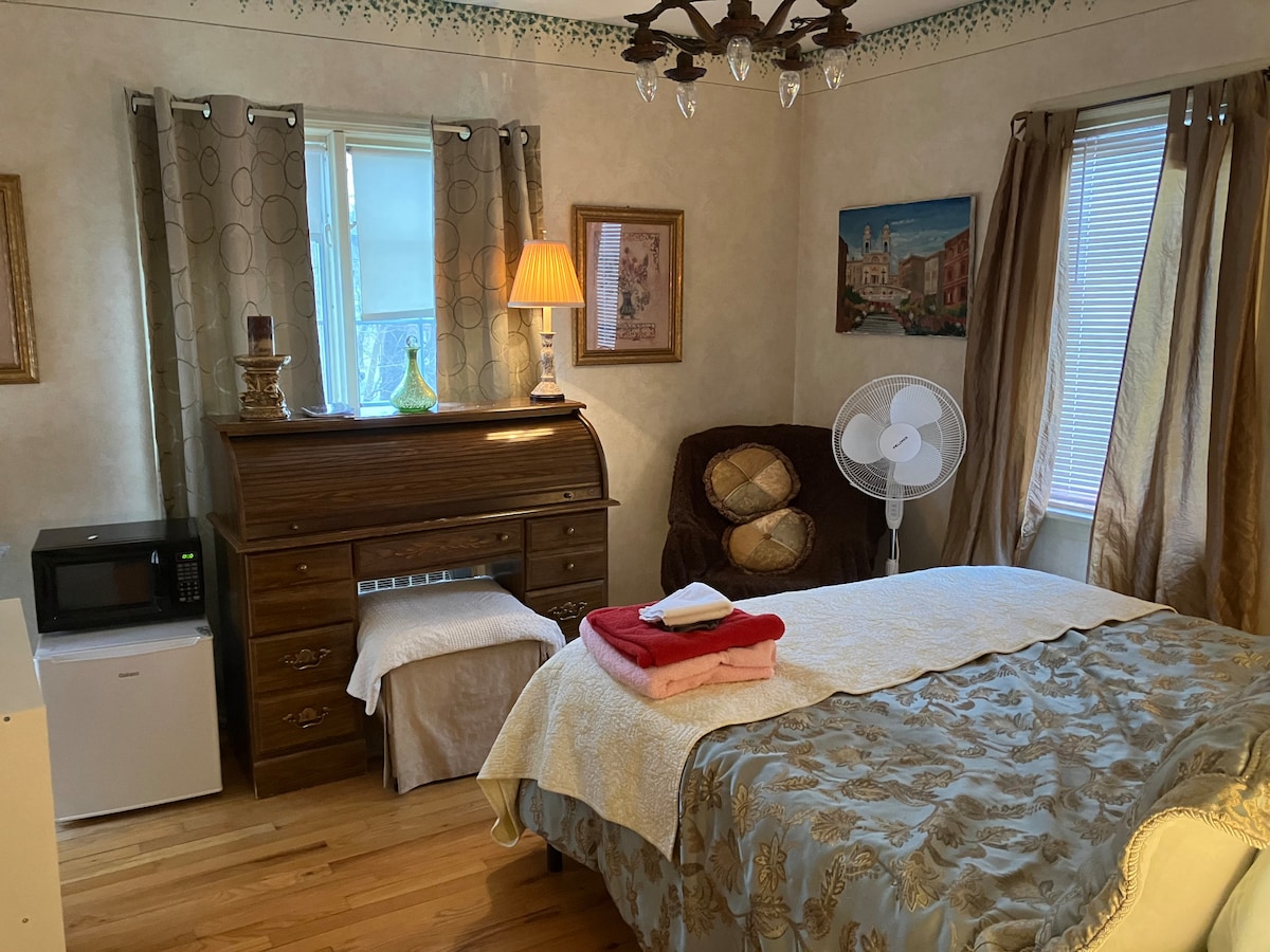 Large private 2nd floor studio style living area with queen size bed, couch, table/chairs, TV, refrigerator, microwave, hot plate, NO OVEN OR STOVE TOP, sink, large shower, A/C, heat, washer and dryer, and deck. Wifi internet is provided. The television has Netflix. No cable channels. The furnace is nontraditional. It is not located in a closet. The noise when running and starting will be louder than normal during winter months. Ear plugs are available for those that are noise sensitive.