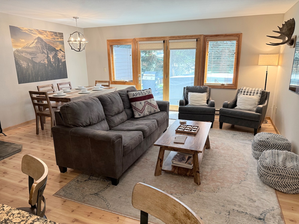 Our condo is the perfect basecamp for your Big Sky adventures! Comfortable for a family or 2 couples, it’s equipped with everything to enjoy your stay. We totally remodeled in 2018, so everything is new. Enjoy a fully equipped kitchen, washer/dryer, pull-out couch, cozy gas fireplace, two bedrooms with queen beds & 2 full baths. We’re right at the end of skier parking - walk out our building, cross the road and hop on the free shuttle! We invite you to enjoy our condo when we’re not there!
