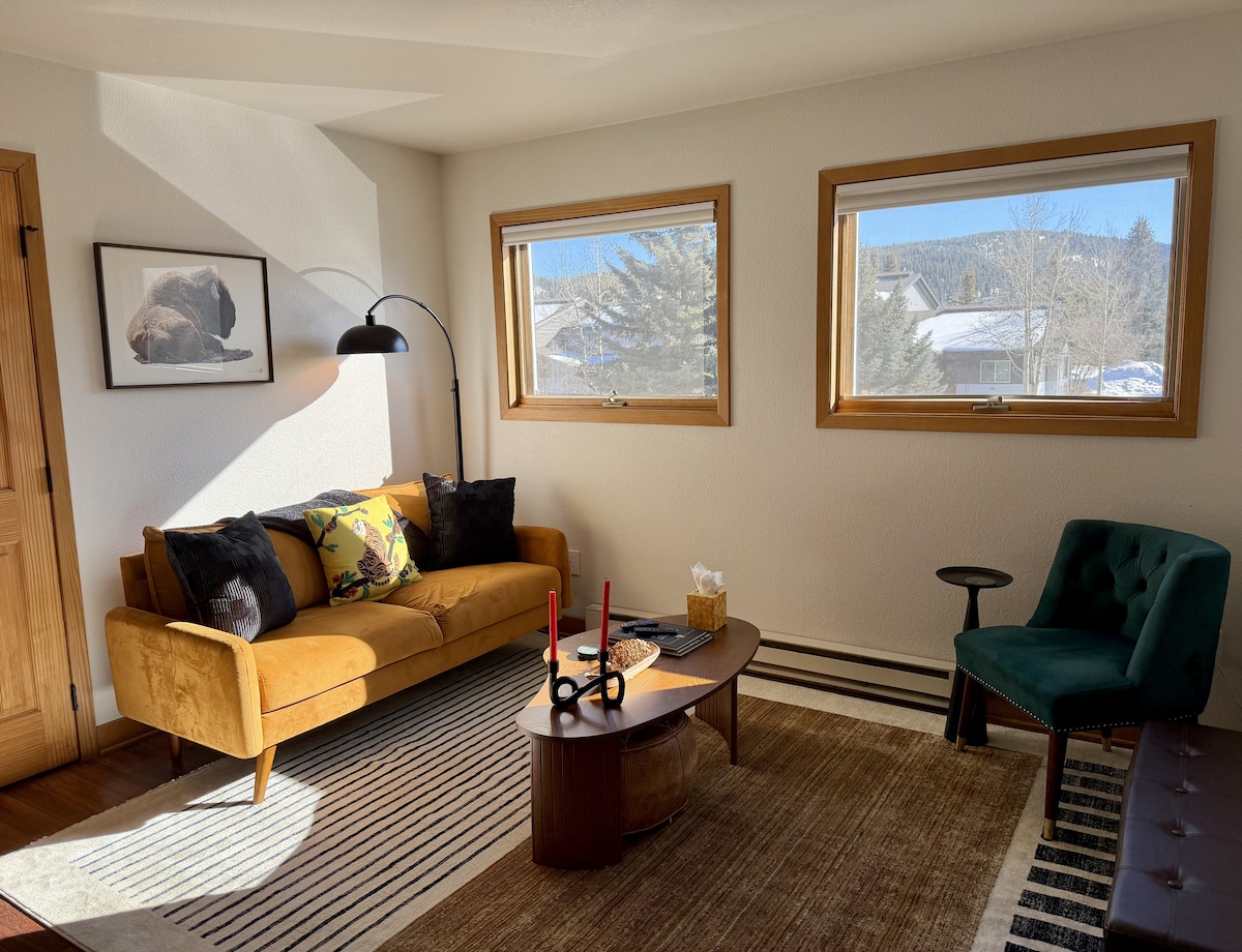 Welcome to your cozy meadow getaway! Newly renovated 2-bed, 1-bath lower-level suite just a short walk from trails, shops, restaurants, bars, the free resort shuttle and more. Accommodating up to 4 guests, the space features king and queen heavenly beds. Comfy living room with dining table. Fully-equipped kitchen with a 2-burner hot plate, convection microwave, and fridge. Free parking spot, private entrance, laundry access and colorful mid-century decor. We look forward to welcoming you!