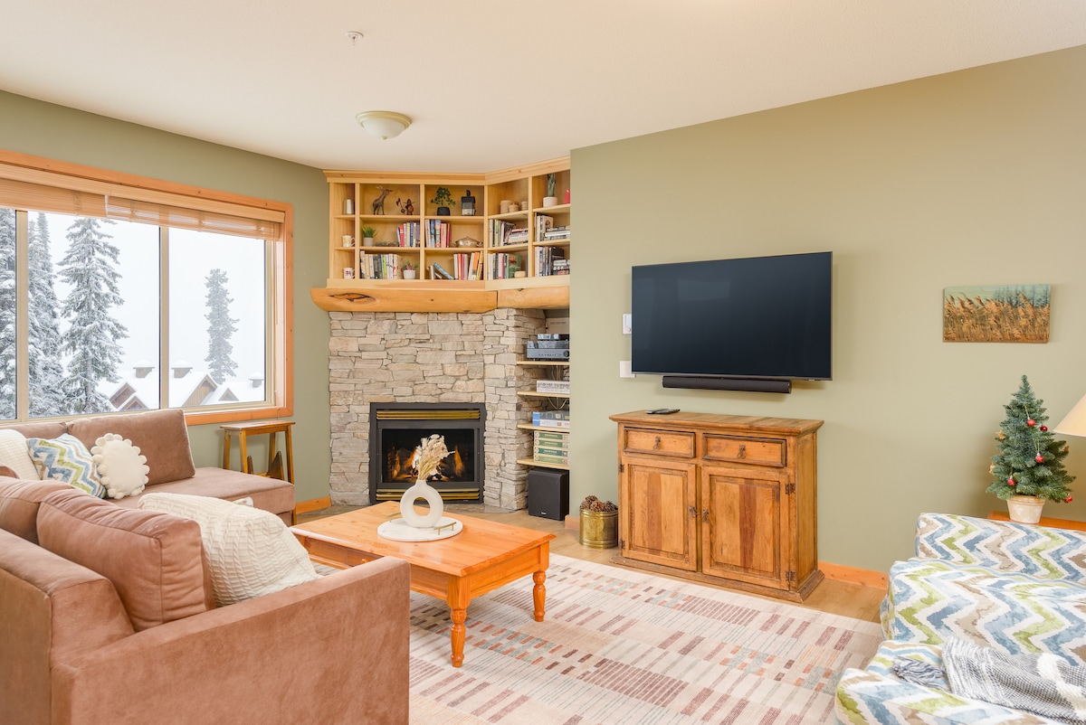 Experience the ultimate mountain escape at our Big White condo! Enjoy ski-in/ski-out access right from your doorstep, hitting the slopes and then relaxing in style. After a day of adventure, cozy up by the gas fireplace, watch shows on the Smart TV, or play board games. Cook up meals in the fully equipped kitchen, and unwind in the serene bedroom with partial slope views. Enjoy two shared hot tubs, a private washer/dryer, and easy access to Big White Village. Book your epic getaway now!