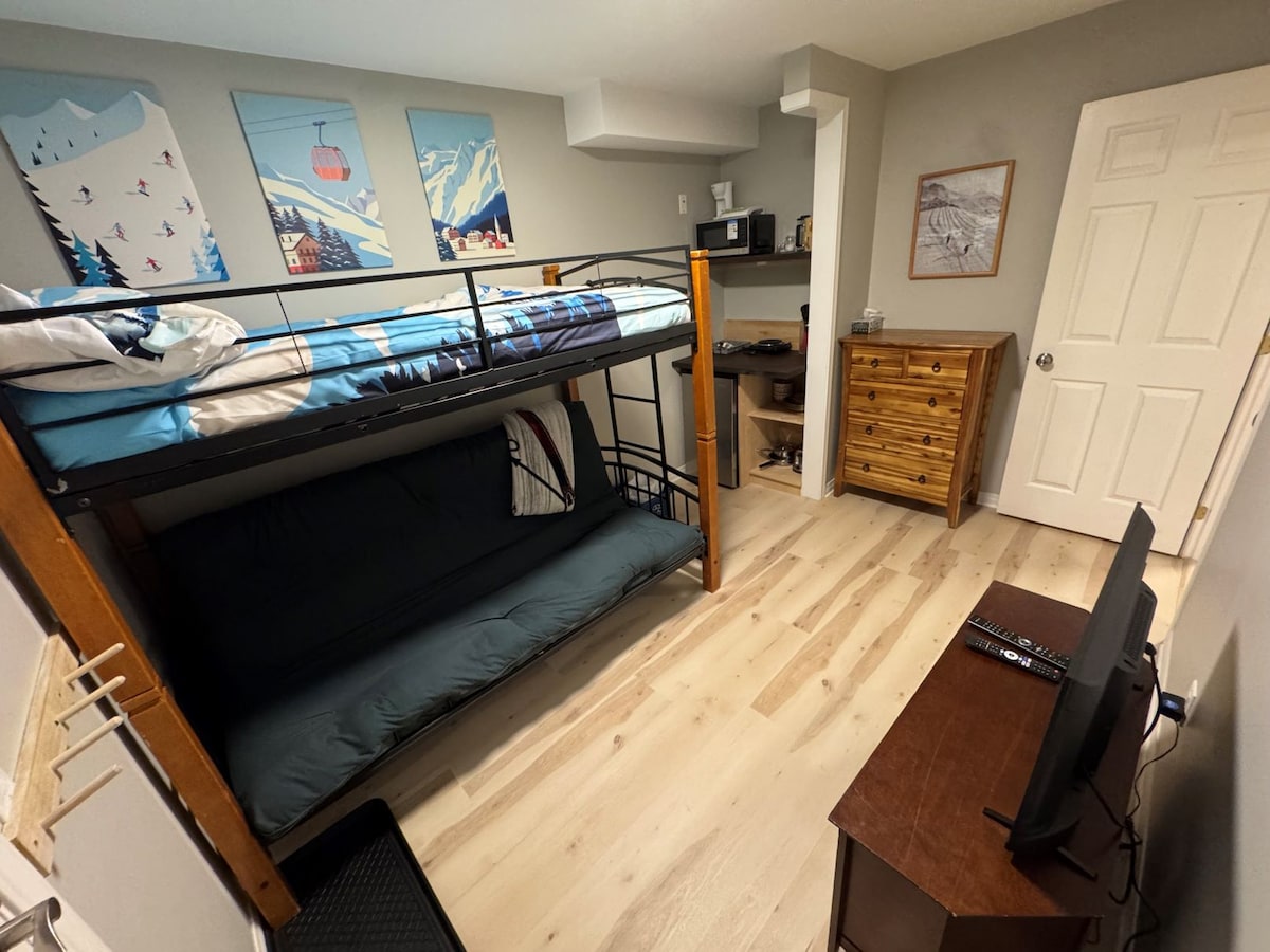 Indulge in a cozy studio suite with true ski in/out access at end of hall! Outfitted with a Murphy bed (queen), pull out couch, cable tv and wifi. Small sitting area next to windows looking out to Moguls ski run. Fully equipped kitchenette with 2 burner stove, small oven, microwave, slow cooker, two mini fridges, and plenty of counter space on the custom built island. There's a French press for making coffee as you watch the snow fall out the Juliette balcony. Backyard photos are the view.