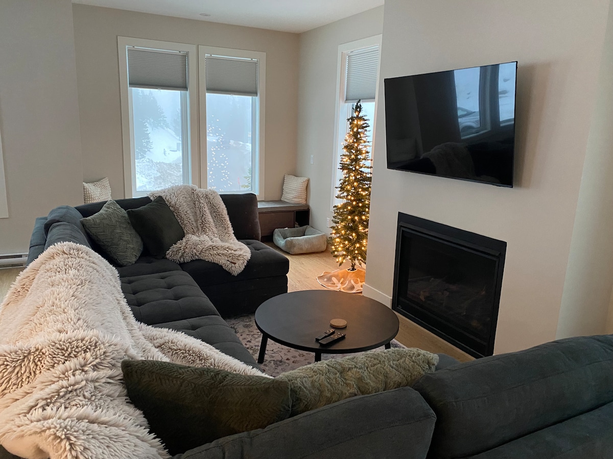 Our beautiful Chalet is a great place to enjoy your vacation at Big White. Built in 2020, and has that new and peaceful feeling. Our unit boasts tall ceilings as well as a beautiful kitchen complete with a wine fridge. When you want to relax, there is a gas fireplace or private hot tub for you to use. There is also plenty of parking with room for 2 cars outside and 2 spaces in the garage. We have added a lounge room toe the main level so that there is more than one space for families to relax