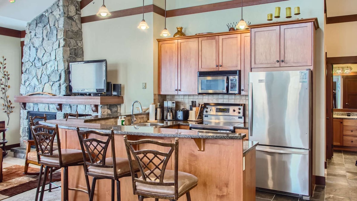 Welcome to The Powder Perch, a cozy-yet-upscale 3-bedroom penthouse in Big White’s Happy Valley. With soaring 16’ ceilings, a private hot tub, and ski-in/ski-out access, this thoughtfully decorated retreat is perfect for families, couples, and friends seeking the ultimate mountain escape. Pet f The Powder Perch blends mountain charm with modern comfort. Gather in the open-concept living room, warmed by a fireplace, or enjoy après-ski drinks in the hot tub while overlooking the Monashee Mountain