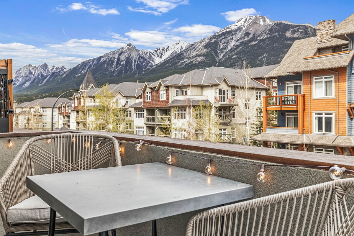 This newly constructed top-floor suite offers an exceptional living experience with breathtaking mountain views. Enjoy premium amenities like the communal rooftop hot tubs or the custom-built wet sauna. Host a BBQ and unwind on your two expansive private balconies. As night falls, gather around the fire table and marvel at the starry skies. Just a short drive from Banff, this property blends luxury and convenience for the ideal mountain getaway.
