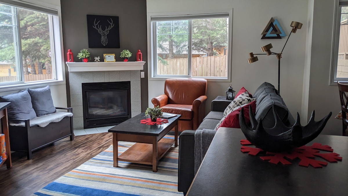 Perfect place to relax after a full day exploring the Rockies! OUT OF BOUNDS is a main floor 2Bedroom/1 bath unit at Banff Boundary Lodge. The Unit sleeps comfortably 6 people and features an open living space, fully equipped kitchen, gas fireplace, in-floor heating, 1 King and 2 Queen beds. Amenities include: Wifi, Cable, outdoor hot tub, BBQ Grills, firepit, laundry facilities and free parking. Easy access to the Banff National Park Gate (2min drive), Canmore (5min) & Banff (15min).