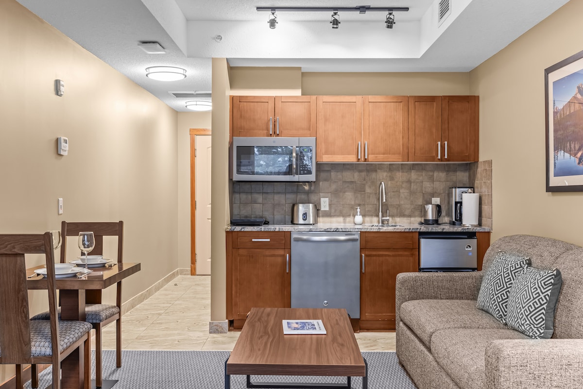 Escape to luxury at Stoneridge Mountain Resort's premium 1-bedroom-1-bathroom suite in Canmore. Enjoy a walk-in shower, full kitchen, cozy fireplace, and a dedicated work area. With a king bed and queen pull-out, it's the epitome of charm. Tucked away on the quiet side, relish your private BBQ and the convenience of a washer/dryer combo. Indulge in the outdoor pool and hot tub, plus complimentary perks – free parking and WiFi. Your tranquil Rockies retreat awaits in this cozy haven.