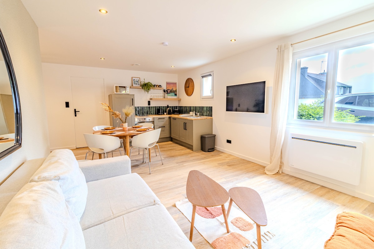 Bright apartment with a covered terrace and private garden, located on the ground floor of a house with private access and no overlooking neighbors. Just a 10-minute walk from Quimper’s city center, enjoy a clear view over the town in a peaceful setting. Perfect for 4 guests, the apartment features: 🛏️ 1 bedroom with a queen-size bed 🛋️ 1 comfortable sofa bed 🍽️ A fully equipped kitchen 🚿 A modern bathroom 🌳 A covered terrace + private garden with outdoor dining and a barbecue.