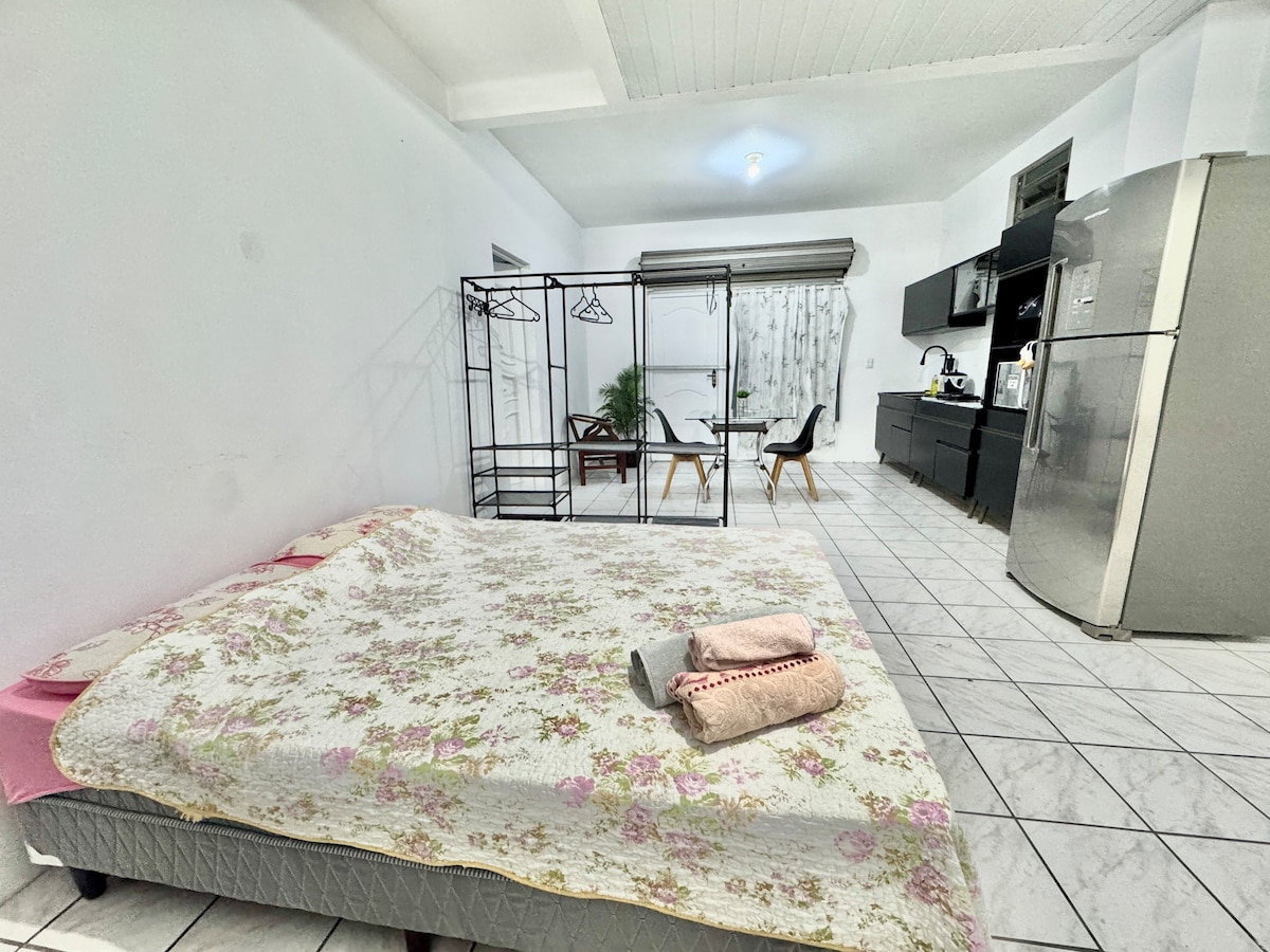 Suíte e cozinha em um só cômodo. Localizada entre as praias de Floripa e Governador Celso Ramos. Próximo (1 m) de Mercado, Padaria, lanchonete, restaurante, polícia civil, parada de ônibus e comércios em geral. Poucos minutos da academia (2 m), universidade Univali e Centro de Biguaçu (6 m). Há 8 minutos da praia Balneário São Miguel em Biguaçu. Estou por perto para ajudar. * Não é possível fazer check in nos seguintes horários: Quarta feira das 19:15 às 21:30 e Sábado das 18:15 às 21:15.