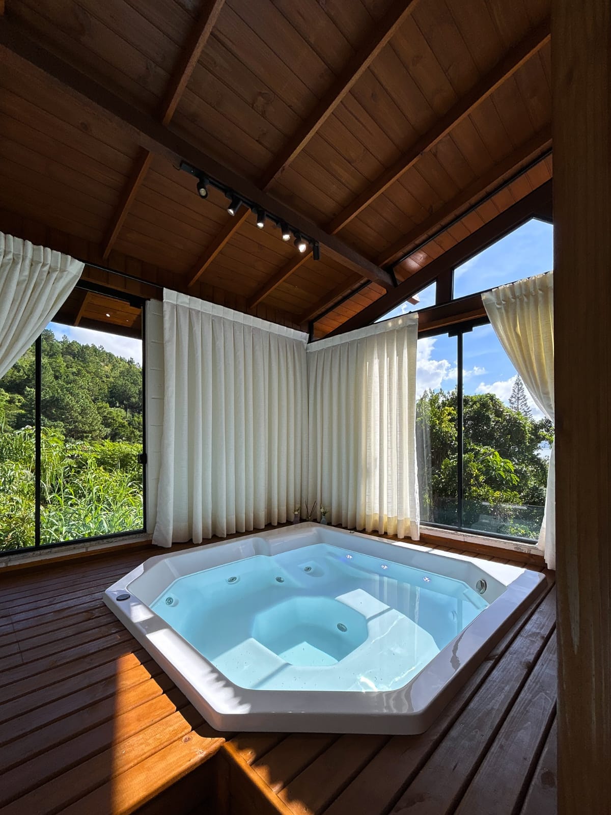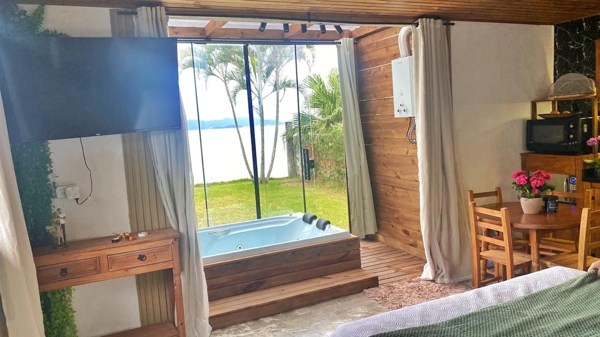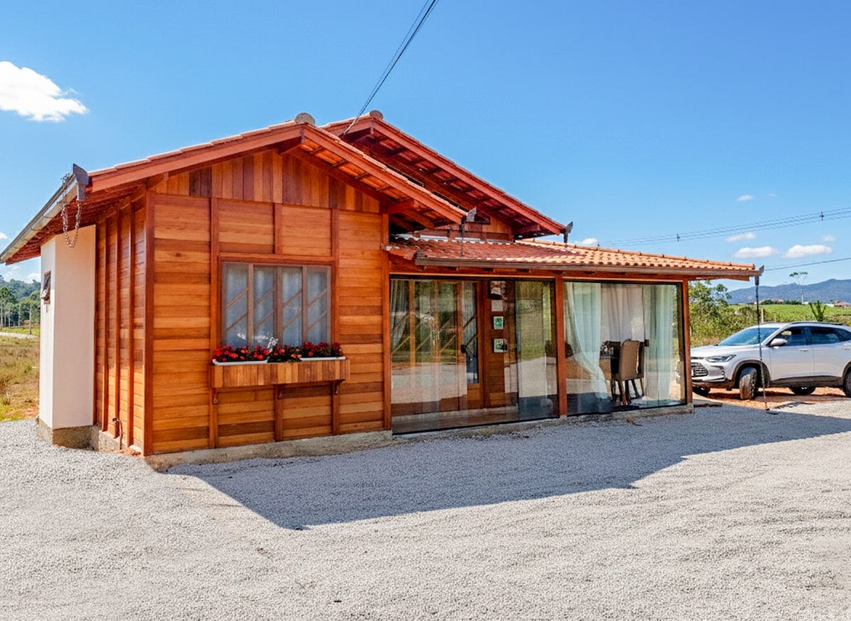 Refúgio encantador em condomínio tranquilo e seguro, com vista para as montanhas. Casa de Madeira, Acomoda até 6 hóspedes, com 2 suítes, 1 banheiro, ar-condicionado na sala e quarto, Wi-Fi e Smart TV. Com cozinha completa, lareira, sofá-cama, churrasqueira a carvão e fogão a lenha. Garagem, máquina de lavar e ambiente pet-friendly. Ideal para quem busca conforto, natureza e dias de descanso. Obs. ônibus gratuito saindo do condomínio para as principais praias. Guesthome