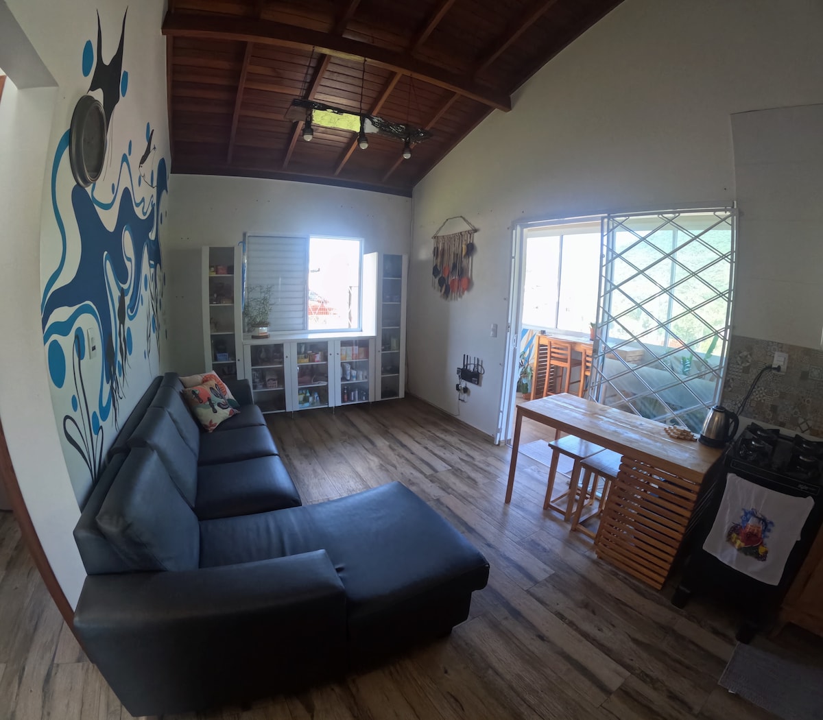 Casa rústica e moderna, térrea, sem escadas e em local afastado, longe de toda preocupação. Vista do Nascer e Pôr-do-Sol no mesmo local. 3 quartos 3 camas Redes de descanso Mesa de Bilhar com vista para as montanhas TV com Netflix Sala integrada a cozinha Fogo de chão com grelha Deck externo Violão e Caixa de Som Cervejeira Balanço no patio Trilhas Estacionamento ao ar livre Tudo que é necessário para esquecer os problemas está aqui. Conheça seu novo refúgio favorito em Antonio Carlos!