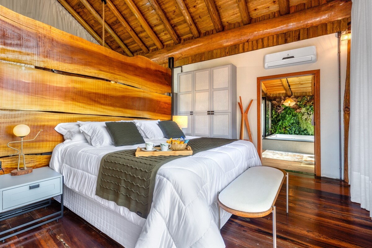 A suíte conta com varanda e hidromassagem. Acomoda 2 adultos em uma confortável cama queen e até 2 crianças em camas auxiliares (sem cobrança de taxas). O acesso é fácil e seguro, com asfalto até o condomínio. Aceitamos pets de pequeno porte com algumas regrinhas: não subir em sofás, camas ou poltronas. Obs 1.: no inverno, piscina em manutenção. Obs 2.: condomínio com casas em construção, o que pode gerar barulho durante a semana (final de semana não há trabalho de construção)