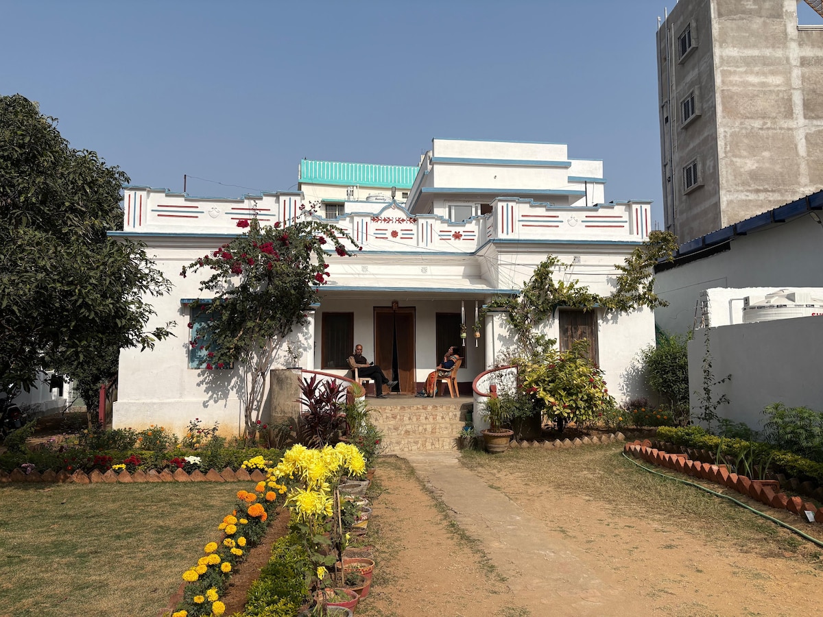 Rustic Bengali-Style Bungalow Near Baba Mandir & Satsang Experience the charm of a traditional Bengali-style bungalow, just minutes from the city centre and Baba Mandir. This retreat offers comforts like AC, fridge, geyser, and stove. Overlooking a vibrant garden, guests may be treated to fresh mangoes, lemons, brinjals or chillies in season. Nestled in a serene, secure neighbourhood, it’s the perfect base for relaxation and exploration. A blend of heritage and convenience awaits you here!