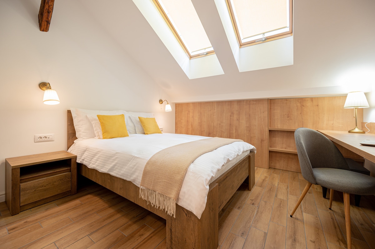 Gorgeous sixth-floor apartment with two beautiful bedrooms, a plush extendable sofa, and room for up to 6 guests. Enjoy a fully equipped kitchen, a spacious walk-in shower, underfloor heating, and do not worry for the warm days, the A/C will keep everything at perfect temperature. Step onto the balcony for sweeping city views. Located just a short walk from the city center, with a convenient parking lot right in front—this space blends comfort, color, and calm for an effortless stay.
