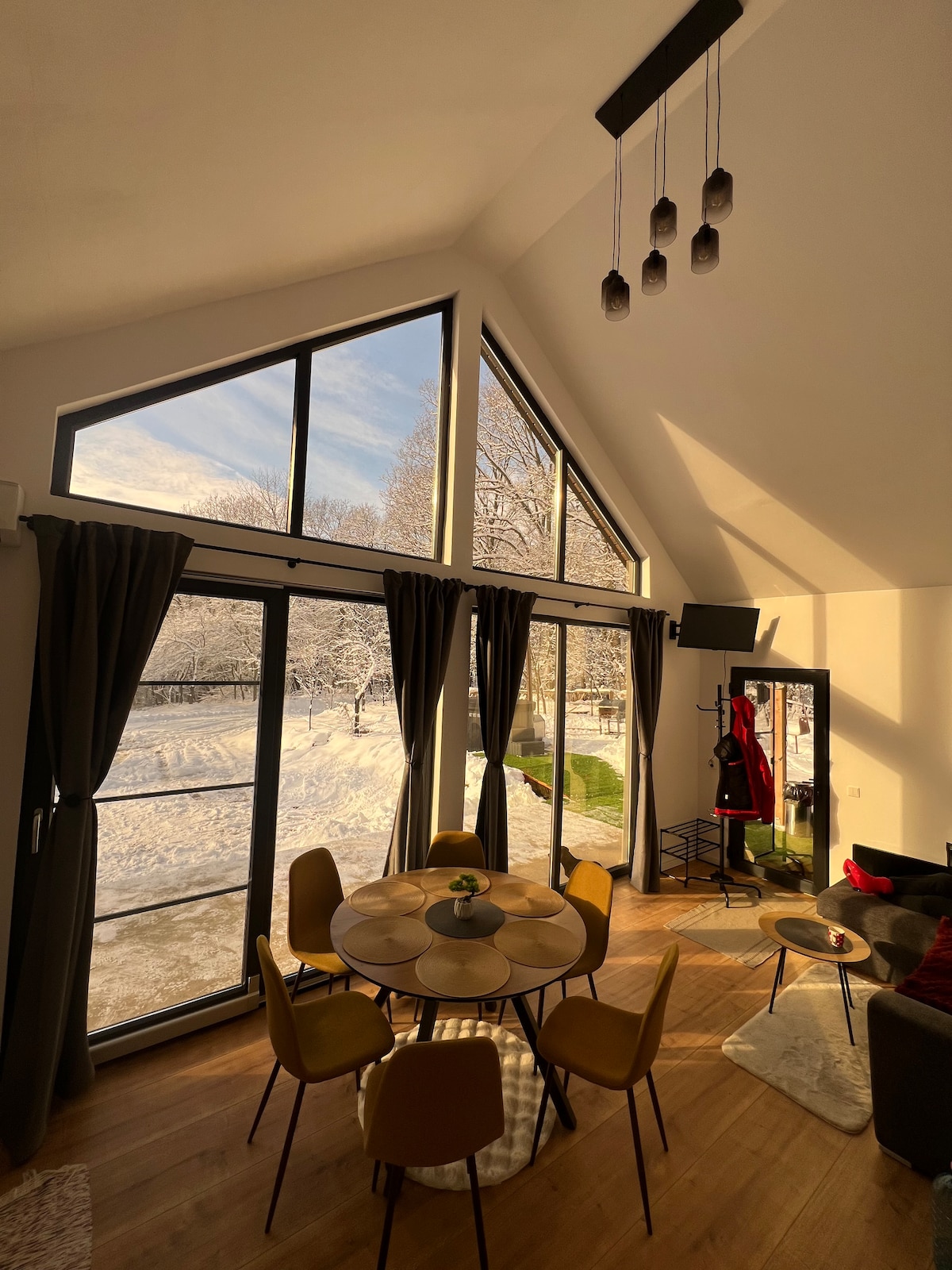 Welcome to our intimate cabin, nestled in the Apuseni Mountains. Step outside and you’ll find a birch forest and a small fishing pond that form the perfect setting for reconnecting with nature and each other. Inside, Tiny Nook continues its natural charm. Wood is the soul of the cabin, present in every detail. The wood-burning stove makes the cabin a perfect hideaway in any season, while the modern amenities ensure you enjoy all the comfort of a modern stay.