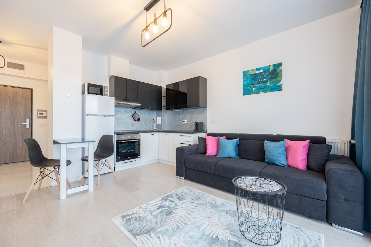Welcome and enjoy your stay in our warm apartment, bursting with natural light. A modern design with a few colourful touches creates a cosy atmosphere. Practical appliances together with a Nespresso coffee machine will ease your stay. Perfectly located in one of the newest and green residential areas in Oradea, close to the University and to a tram station. Professional cleaning and disinfection protocol. Fast and easy access through the property with a code-based system.