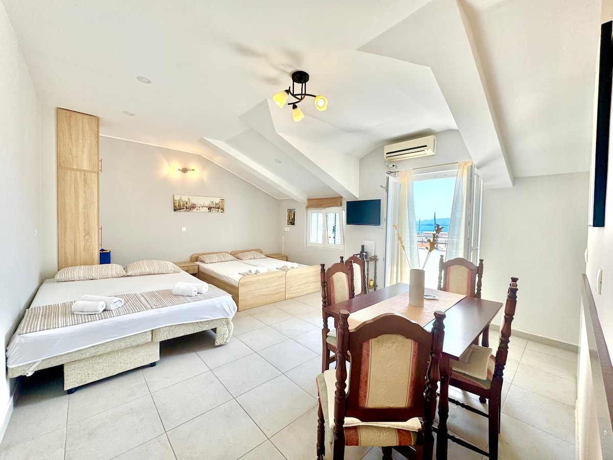 The studio/apartment is located on the first floor of the house and features its own kitchen, bathroom, and private balcony. From the balcony, you can enjoy beautiful views of Boka Bay and the Verige Strait. Guests also have access to the terraces in front of the house, which are arranged on three levels. These terraces offer dining and coffee tables, as well as an outdoor shower — perfect for relaxing and enjoying the fresh sea air.