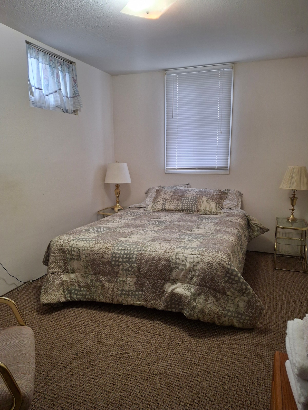 Spacious two bedroom, 1 bath basement apartment with full kitchen (stove, fridge/freezer, microwave, toaster, utensils, silverware, etc. The living room has a nice free-standing gas fireplace, which makes the apartment very cozy. There is also a TV with an Amazon Firestick, allowing guests access to Netflix, Hulu, YouTube, etc. Each bedroom has a comfortable queen sized bed, dresser, and electric fireplace for added comfort and ambiance.