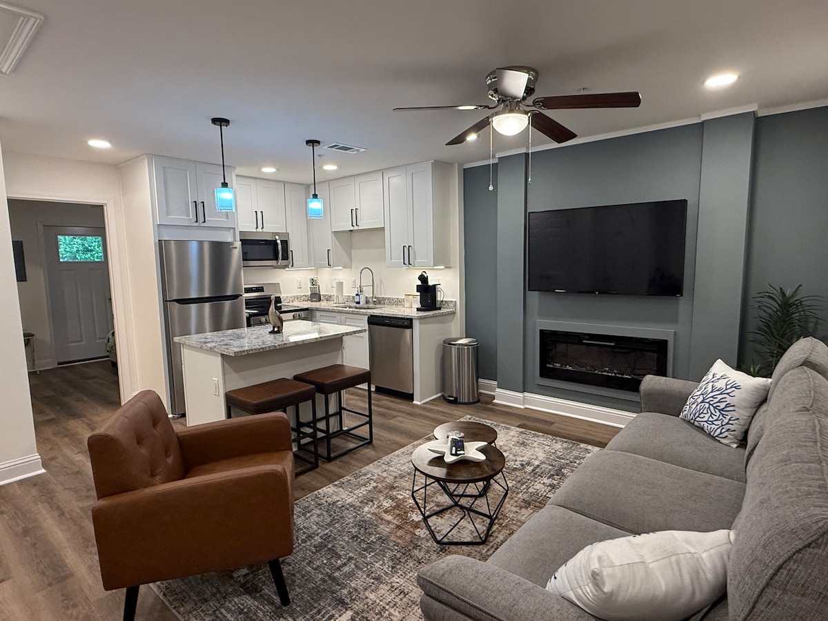 4 well appointed newly constructed vacation rental units one block from the beach. Walking distance to casinos, downtown Biloxi and very near to Ocean Springs. Each unit is 1250 sqft with a full kitchen, living room, 1/2 bath on 1st floor. Primary bedroom (King bed/full bath), secondary bedroom (Queen bed/full bath) and full size laundry on 2nd floor. Sleeping accommodations for up to 6. Smart TVs in each bedroom and Living Room. Free Wi-Fi. Structure is elevated with covered parking beneath it.