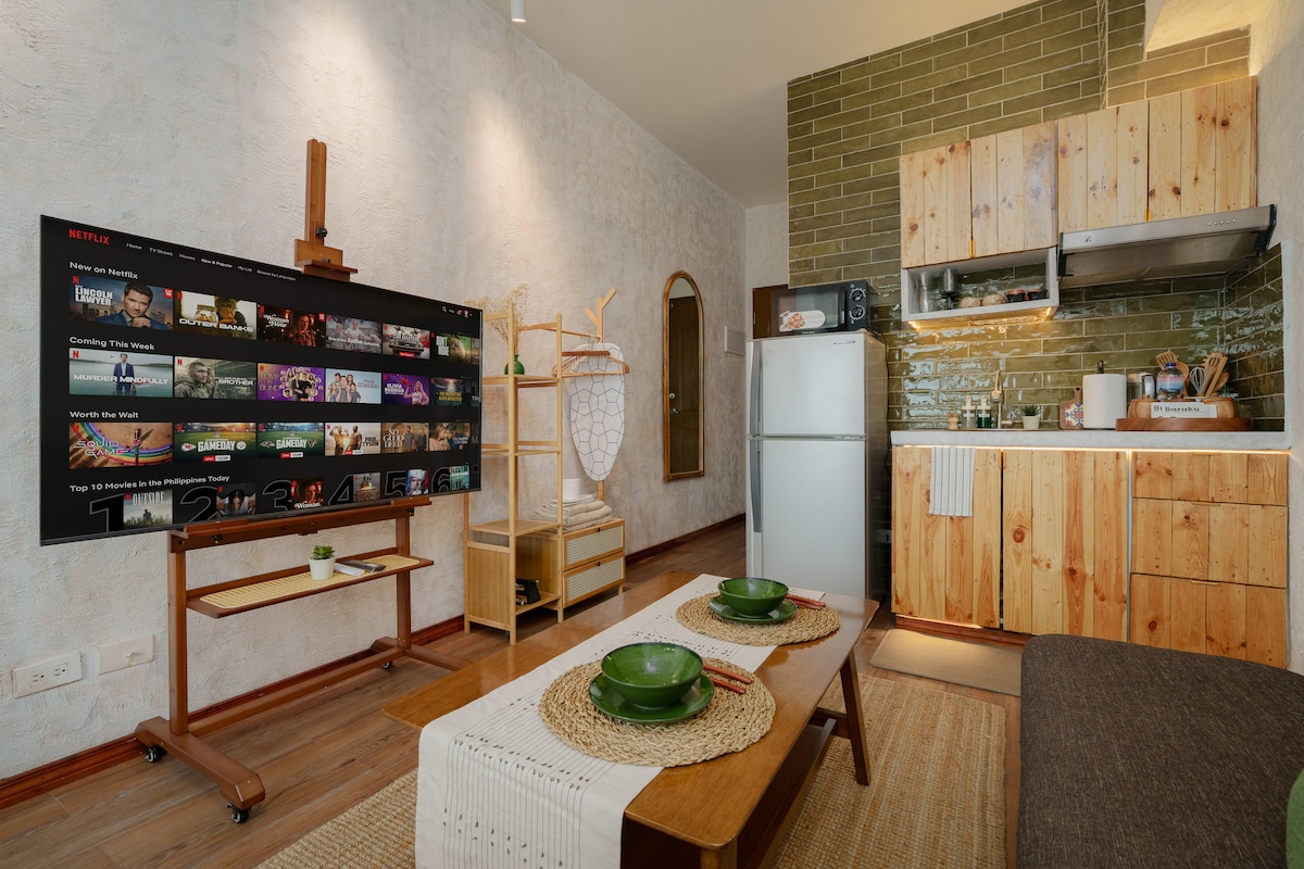 Olllaa I’m Bella! My unit is a 32sqm studio w/ Balcony Boho-Modern style getaway at One Palm Tree Villas in Newport, Pasay City! -Conveniently located just a 3-5 min walk from NAIA Terminal 3 via Runway manila. - High speed Wifi (150mbps) -Netflix/HBO-Go/Youtube -Free access to Pool -Complete with basic essentials,Hot and cold shower, complete Kitchen utensils and can cook Perfect for travelers seeking comfort and accessibility. Enjoy easy access to nearby restaurants, salons and many more..