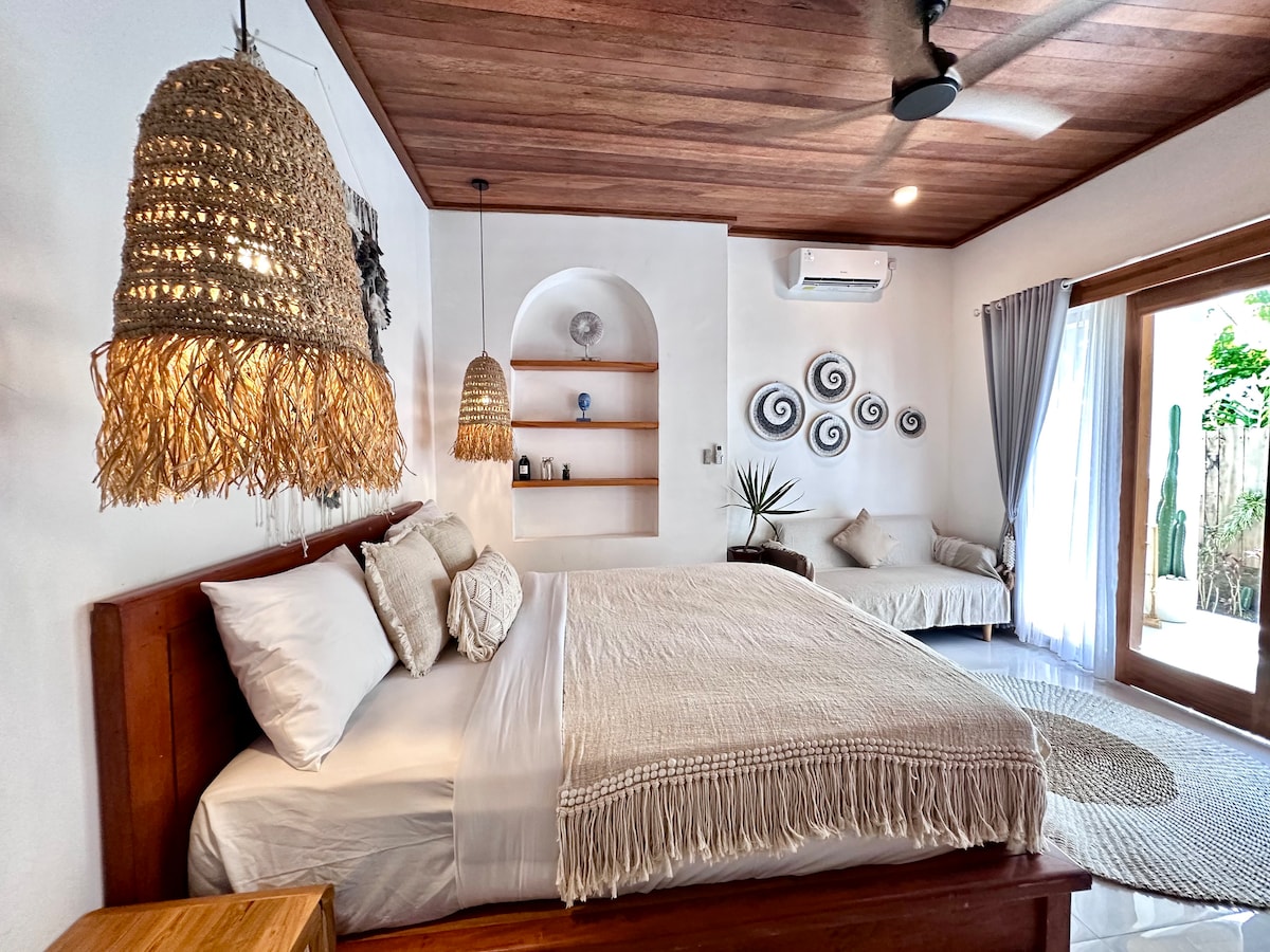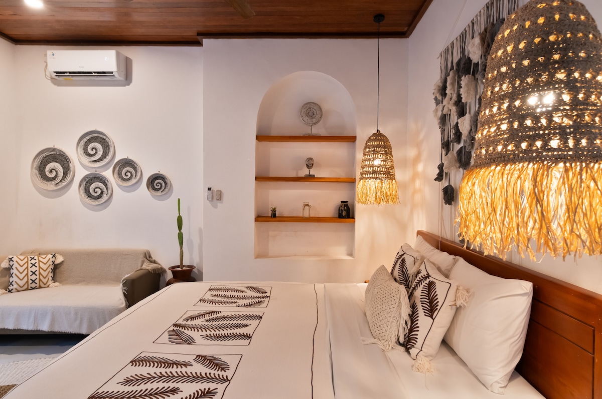 Calista Studios are comprised of 4 x 1 BR studios, situated side by side, each with their own unique style. Nestled in a peaceful Balinese neighborhood, this is a perfect retreat for creatives and travelers who appreciate the beauty in intricate details. With its 2 floors, the clever design maximizes functionality with a cozy, comfortable atmosphere, spacious king-size bed, fully equipped kitchenette, and a work-friendly nook that's ideal for writing, sketching, or planning your next adventure.
