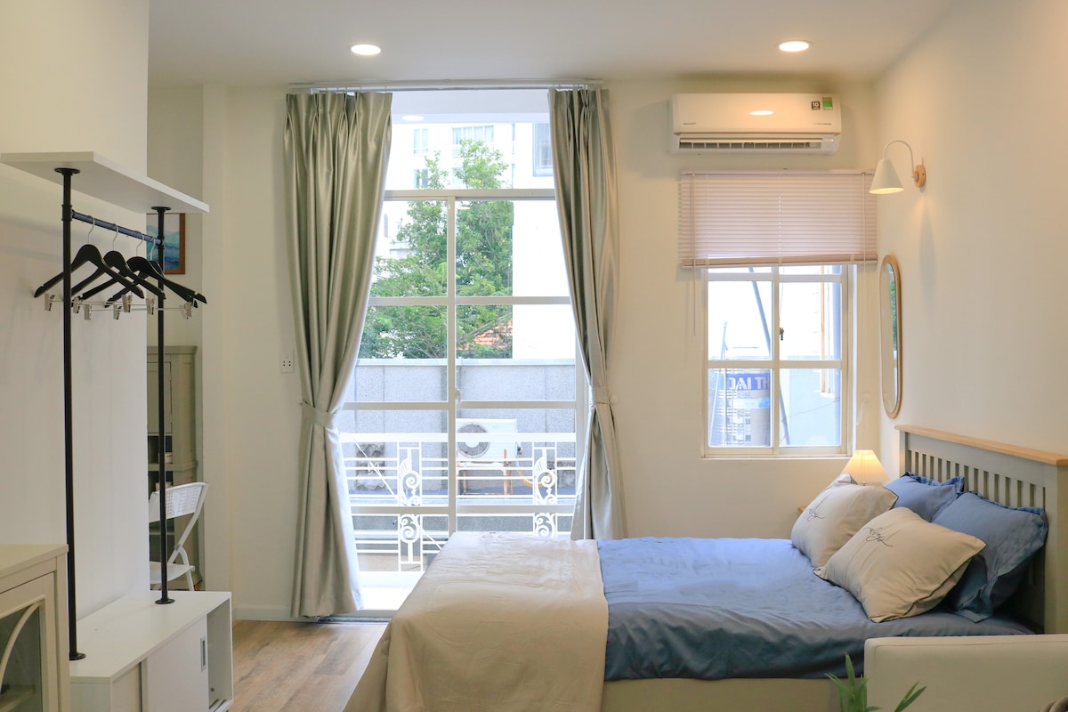 Spacious 27 m² recently renovated studio in a 5-story villa. Bright with a large window and a small balcony for fresh air. The room is designed,d in a tropical minimal style. Comfy queen bed, work desk, sofa bed, and Smart TV with Netflix. Centrally located near D1, D10, and the airport. Within walking distance to authentic eateries, cozy cafés, bustling shopping streets, and cinemas like CGV and Mega GS. Perfect for long stays, this blend of comfort, style, and convenience.