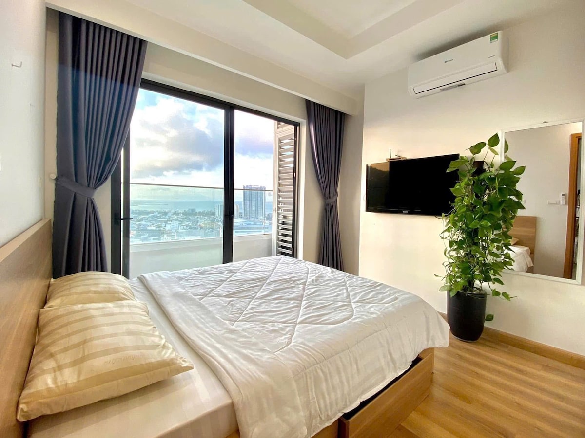 Discover the ultimate relaxation in our stunning one bed apartment with breathtaking ocean views. Located in center of city: – 50 meters walk to the Beautiful Beach. – 10m to the Quy Nhon War Museum – 950 meters away from Long Khanh Pagoda – A lot of shopping malls, local foods, stylish coffee shops & bars etc. nearby. - Bright, Clean, Greenview ・Free WiFi, Fully Air-conditioned ・Pool, Gyms and are available on the 3rd floor (with fee)