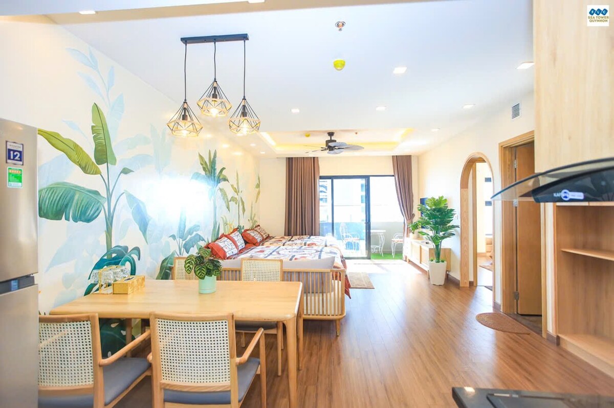 Căn hộ xinh xắn nằm ở vị trí trung tâm thành phố Quy Nhơn. Thuận tiện cho việc di chuyển tới các khu ăn uống và vui chơi sầm uất! View căn hộ hướng về phía biển và thành phố, phù hợp cho gia đình có con nhỏ, bạn bè tới lưu trú. Ngoài ra căn hộ còn trang bị đầy đủ đồ dùng nấu ăn để khách hàng có thể tự nấu ăn mang lại cảm giác như chính ngôi nhà của mình!