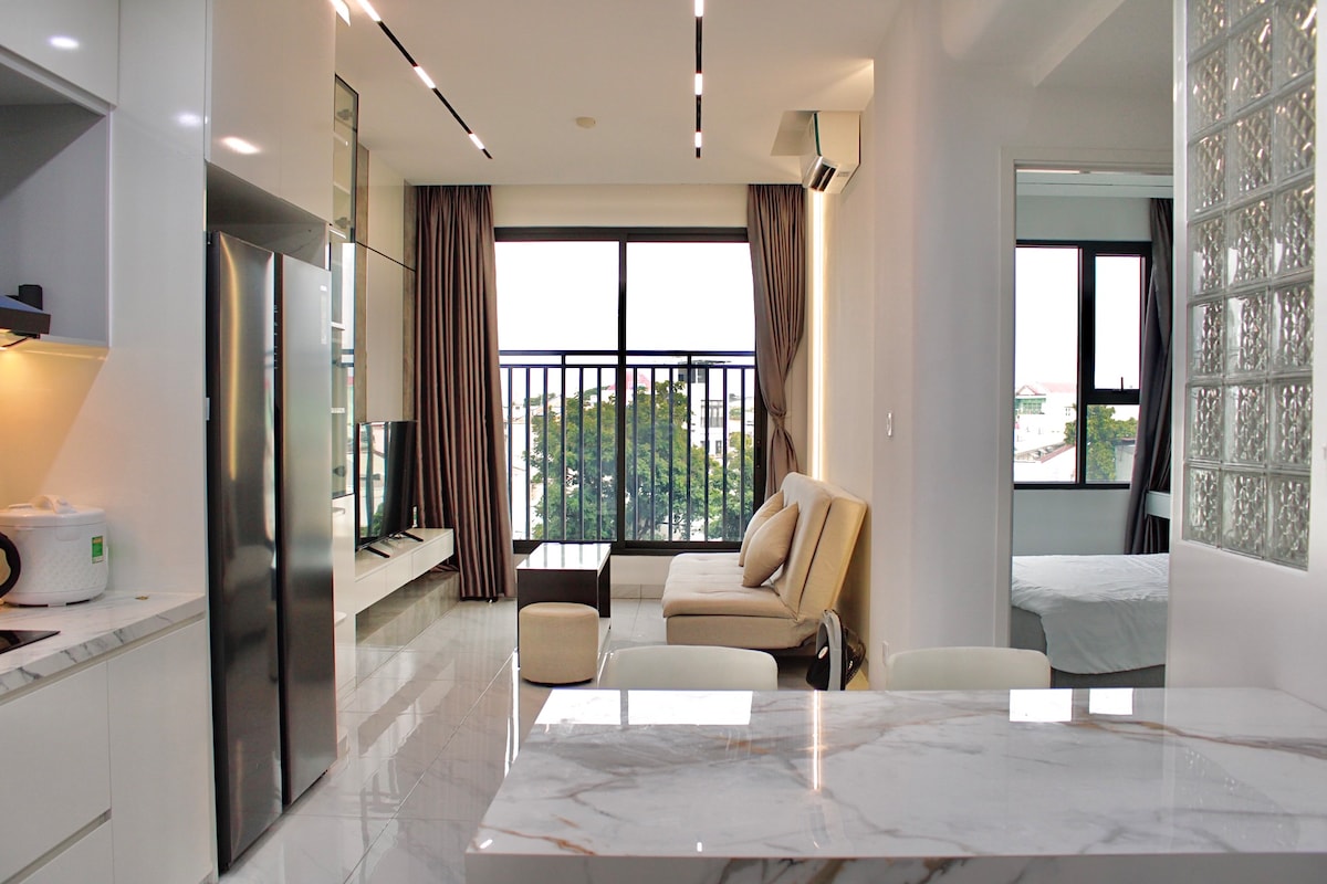 Căn hộ dịch vụ hiện đại được trang bị đầy đủ nội thất. Phong cách đơn giản trẻ trung. Toà nhà mới xây dựng, sạch sẽ, yên tĩnh và thoáng mát với balcon riêng mỗi phòng.
