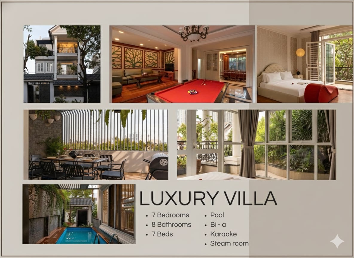 Villa sang trọng giữa lòng Quận 2 – Trải nghiệm nghỉ dưỡng đẳng cấp Tọa lạc ngay trung tâm Quận 2, TP.HCM, căn villa hiện đại với 7 phòng ngủ, 8 giường và 7 phòng tắm là lựa chọn lý tưởng cho gia đình hoặc nhóm bạn đang tìm kiếm không gian nghỉ dưỡng riêng tư và tiện nghi. Villa nổi bật với: Hồ bơi riêng & sân vườn xanh mát Phòng karaoke, bàn bi-a & khu BBQ ngoài trời Phòng xông hơi, mang lại trải nghiệm thư giãn như spa Thiết kế hiện đại, nội thất sang trọng, đầy đủ tiện nghi chuẩn resort