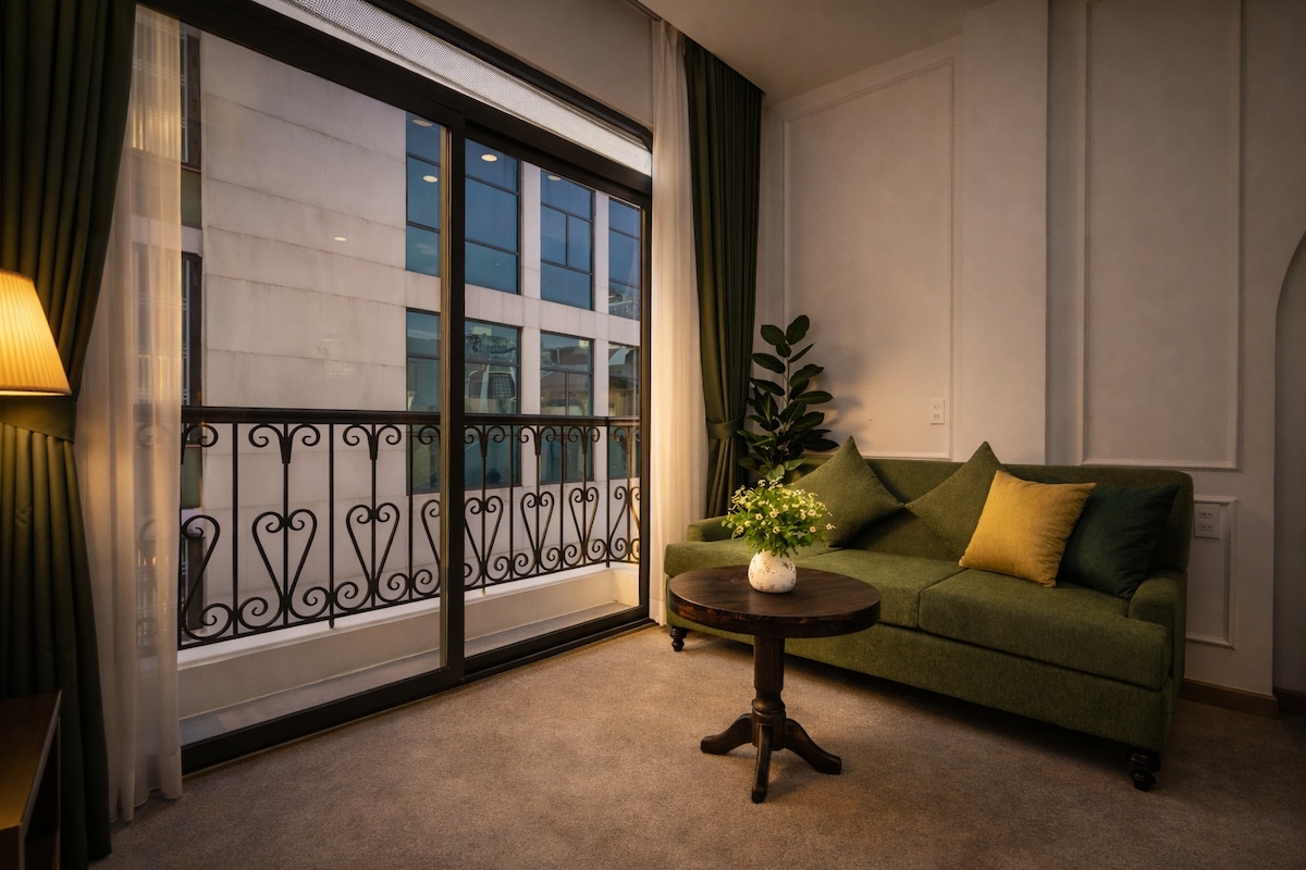Calm, nature-inspired and restorative, our Olive Green Serenity Balcony Studio is designed for guests seeking a peaceful retreat in the middle of the city. Soft green tones, natural textures and a private balcony create a serene and grounding atmosphere.