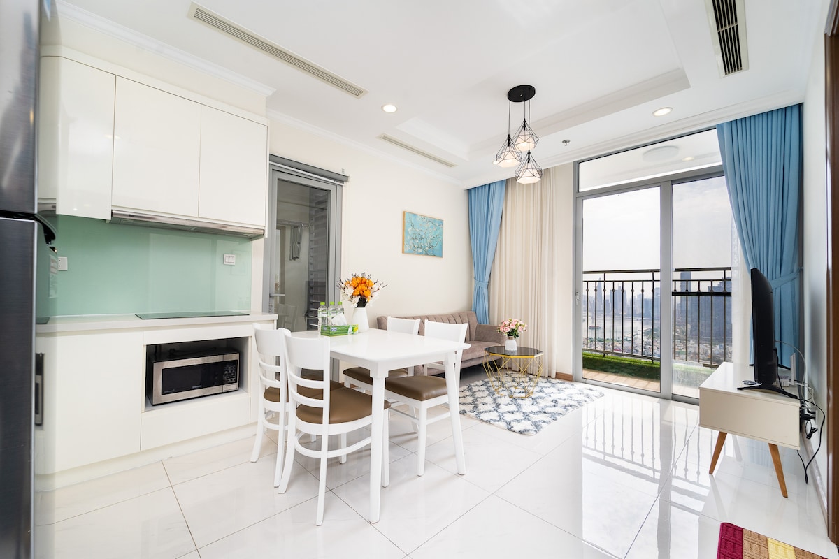 Cozy luxury apt on 6th floor located in a prime location just 10 minutes drive from the city center. 64sqm wide apt with all amenities and space to make you feel like at home. You can lie down on a soft king-size bed for a good night's sleep, cook in the kitchen, lie on the sofa watching the Landmark 81 building sparkle at night or sip a hot cup of coffee on the balcony watching the sunrise. A luxurious rooftop swimming pool, 2 mini supermarkets: 7 eleven and Winmart. Friendly and helpful owner.