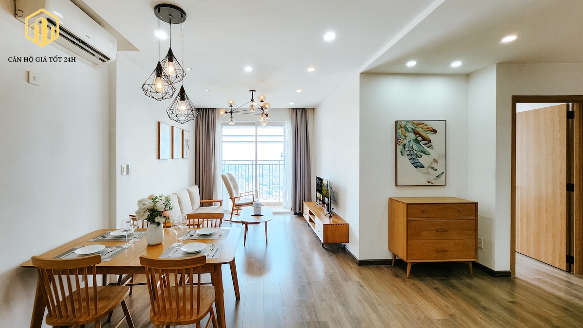 A stylish & comfortable apartment 85m2 at Hung Phuc Happy Residence Premier located in the heart of district 7, Phu My Hung, with just a short walk to all the best shops, restaurants, and conveniences. Nearest bus stop in front. Highly educated and quite neighbors that surrounded by green parks and beautiful villas. Decorated in modern Japandi x Wabi sabi style with a focus on natural materials & clean lines. A great getaway or even staycation for those who want to experience new things.