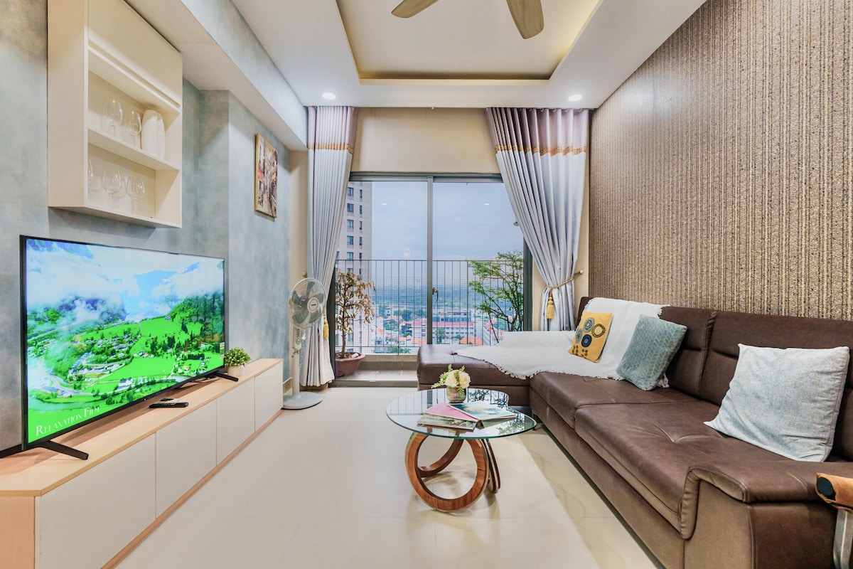 Cozy luxury apt on 6th floor located in a prime location just 10 minutes drive from the city center. 64sqm wide apt with all amenities and space to make you feel like at home. You can lie down on a soft king-size bed for a good night's sleep, cook in the kitchen, lie on the sofa watching the Landmark 81 building sparkle at night or sip a hot cup of coffee on the balcony watching the sunrise. A luxurious rooftop swimming pool, 2 mini supermarkets: 7 eleven and Winmart. Friendly and helpful owner.
