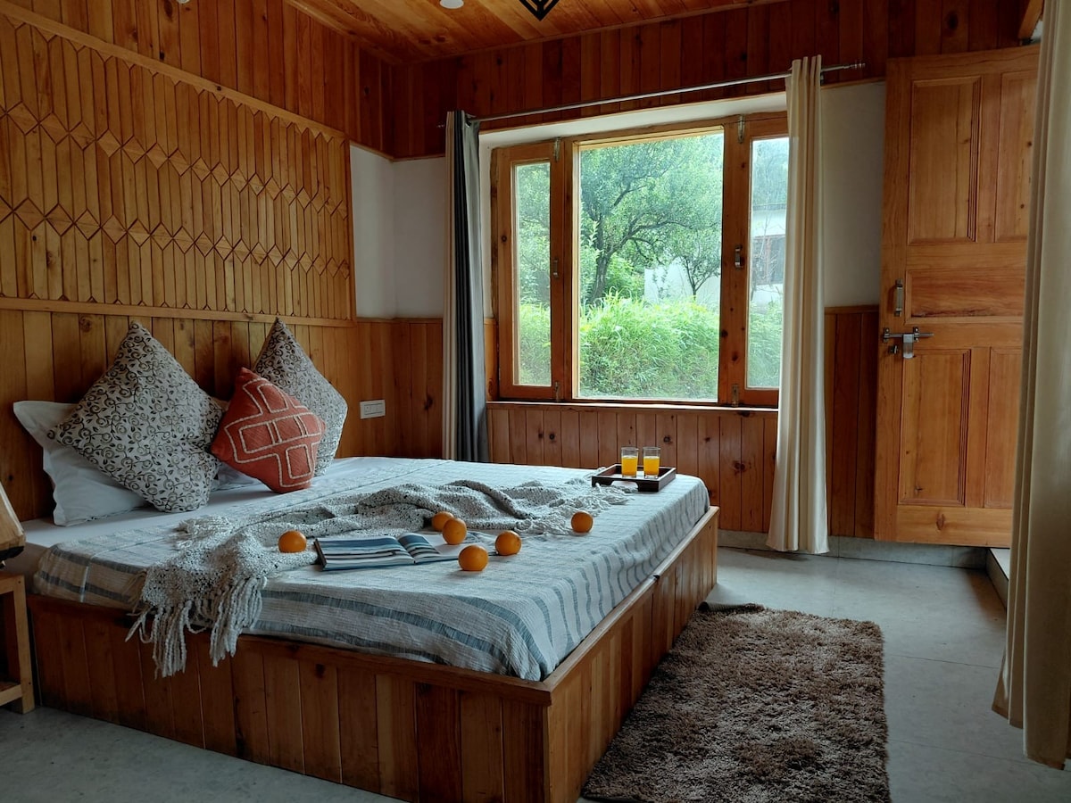 "Welcome to our cozy log cabin nestled in the heart of the enchanting Jibhi, Himachal Pradesh, where every morning, you'll wake up to breathtaking views of the majestic Jalori Pass. Our log cabin-style property provides a warm and rustic ambiance that's perfectly complemented by modern amenities for your comfort. The bedroom offers an incredible view of Jalori Pass, making each morning a magical moment as you open your eyes to nature's grandeur,