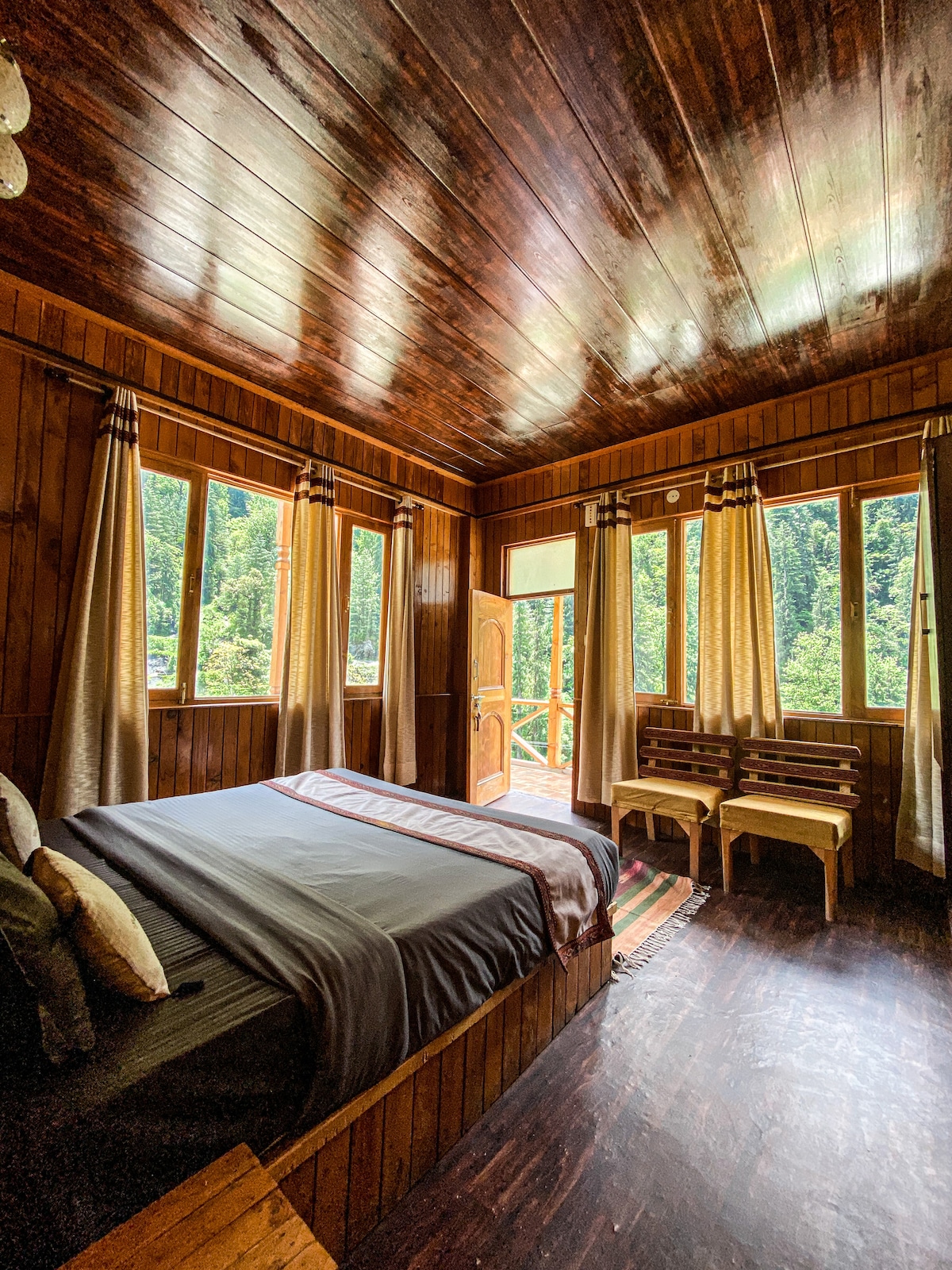"Welcome to our cozy log cabin nestled in the heart of the enchanting Jibhi, Himachal Pradesh, where every morning, you'll wake up to breathtaking views of the majestic Jalori Pass. Our log cabin-style property provides a warm and rustic ambiance that's perfectly complemented by modern amenities for your comfort. The bedroom offers an incredible view of Jalori Pass, making each morning a magical moment as you open your eyes to nature's grandeur,