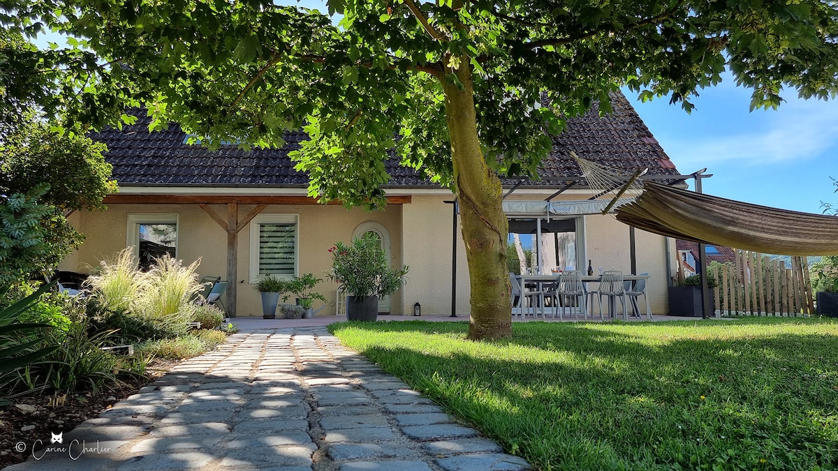 Entre vignoble et forêt, dans un parc ombragé, nous vous accueillons dans une maison typiquement champenoise dont l'annexe a été aménagée pour votre confort. Elle est indépendante de la maison et s'ouvre sur un grand jardin où vous pourrez vous reposer et déjeuner en écoutant le bruit de la fontaine et du ruisseau. Vous pourrez faire des promenades dans le vignoble et dans la forêt. Epernay et ses fameuses caves de Champagne est à 15 min en voiture, Reims à 40 min et Paris à 1 h de train.