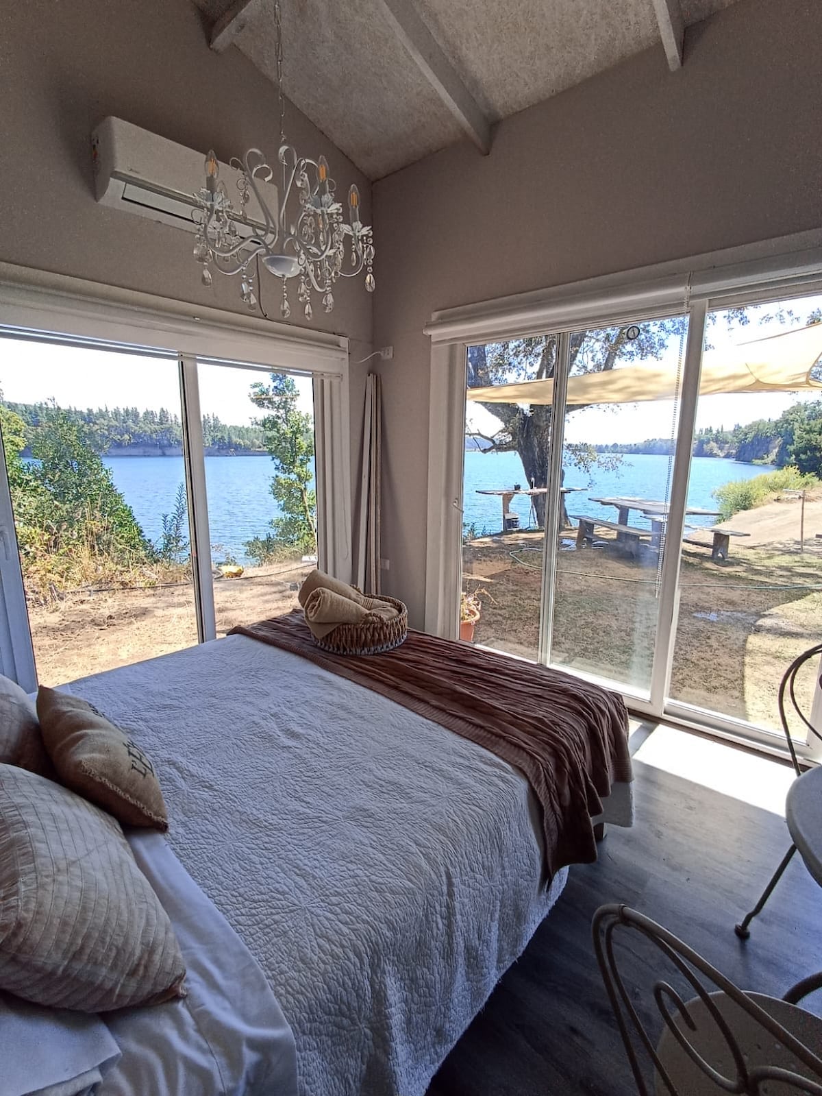 Escápate a la tranquilidad de esta acogedora cabaña a orillas del lago, hasta 4 personas. Nuestra cabaña ofrece un espacio cómodo y funcional. Cuenta con cocina equipada con todo lo necesario, baño completo y una pequeña área de comedor. En el exterior, una mesa con mesón está dispuesta para disfrutar de comidas al aire libre, mientras se contempla la hermosa vista al lago. Además, la cabaña tiene acceso directo al agua. Un lugar perfecto para desconectar y disfrutar de la naturaleza.
