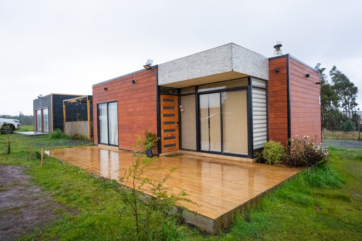 Cabaña Tiny house para dos personas (posibilidad de más). Estamos ubicados a 5 min de Yumbel, 30 min de Los Ángeles, 50 minutos de Concepción y 20 min de Saltos del Laja. Nuestra cabaña cuenta con cocina equipada completa, baño con agua caliente, Tv (con suscripción a Netflix y Disney), wifi, calefacción, estacionamiento privado. El exterior cuenta con Tinaja de uso ilimitado ambientado con luces cálidas, con quincho para asados y fogata, todo dentro del recinto. El lugar es privado y seguro.