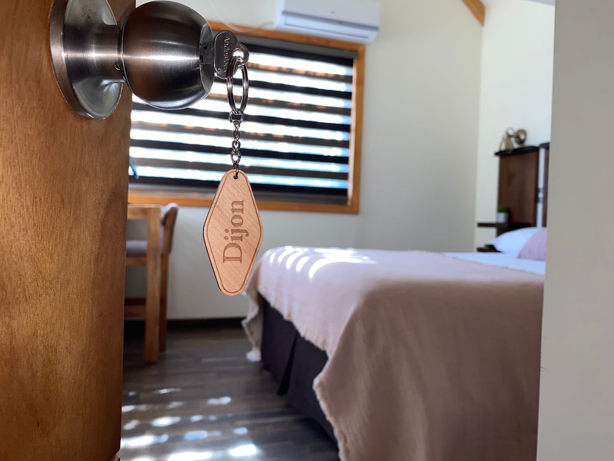 Encantadora habitación doble matrimonial en una casona colonial, con estufa a combustión lenta y baño privado en suite. Vista a jardines, piscina y corredor posterior. Incluye desayuno y acceso a quincho, piscina, corredores y amplios jardines. A solo 1,5 km de la Ruta 5.