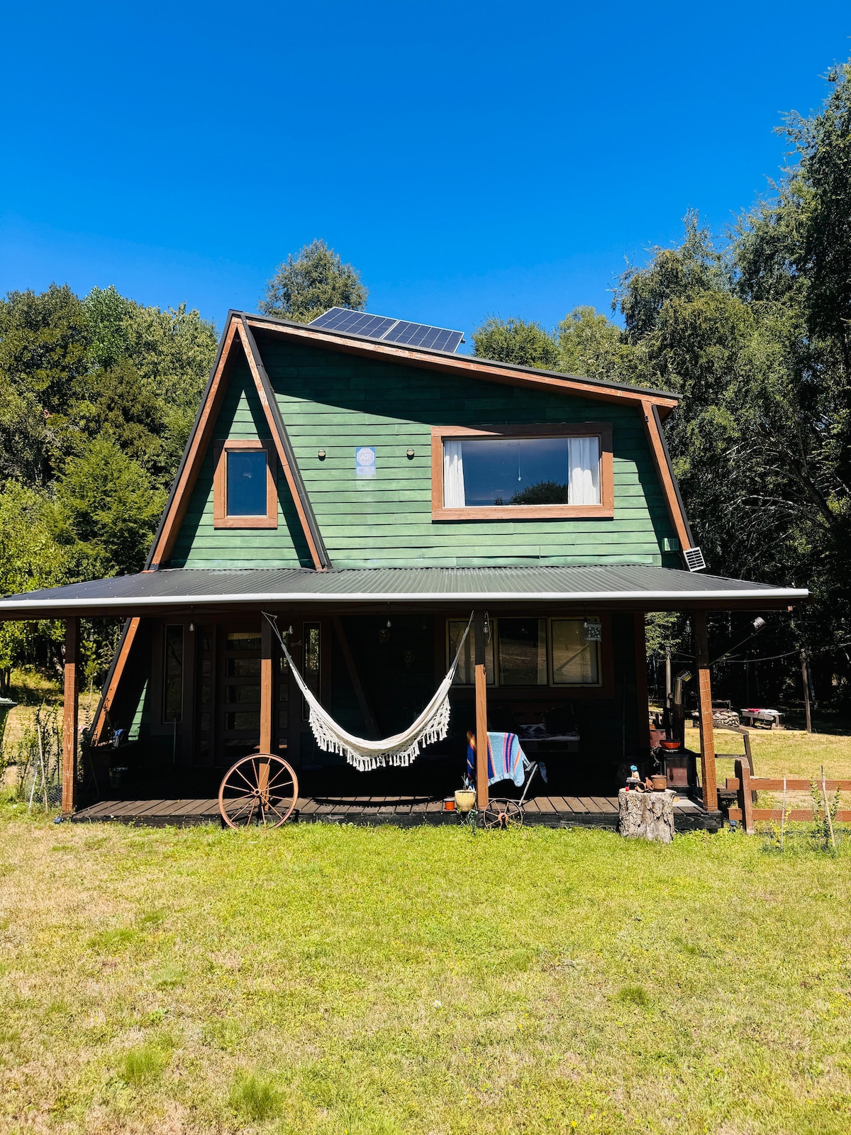 Un espacio pensado para conectar con la naturaleza y vivir momentos inolvidables. Disfruta del verde, la paz del campo y el ruido del estero. Preciosa cabaña campestre a orillas del estero poñén. Con tinaja y terraza con parrilla privada. Cuenta con una habitación matrimonial y otra habitación doble. Adicional un futón. Baño completo con agua caliente. Comedor y sala con estufa a combustión lenta. Cocina completa. Estacionamiento privado.