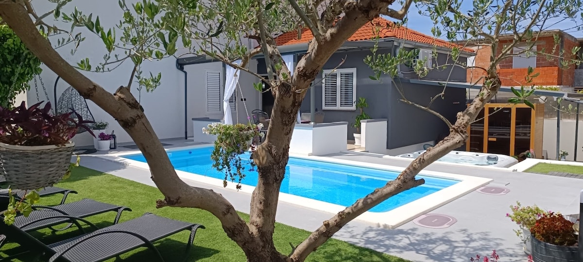 GRIJANI BAZEN. Avio- destinacija. Vrhunska lokacija u centru grada..Ovaj objekt sadrzi 3 klimatizirane sobe s velikim televizorima,kuhinju i dnevni boravak ,2 kupatila, terasu, bazen,vanjski jacuzzi,saunu, rostilj ,vanjske tuševe i ležaljke, parking u dvoristu. Nalazi u mirnom dijelu centra Zadra 900 metara od starog grada. Znamenitosti grada i restorani nalaze na 15minuta hodanja od apartmana. Zracna luka udaljena 10 km. Savrseno za mirni i ugodni odmor .Optički internet.Dobro došli