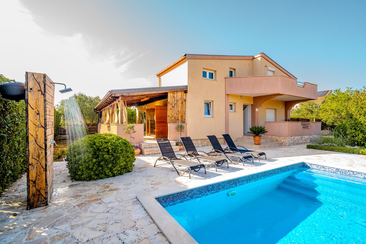 This beautiful villa with heated pool, hot tub and sauna is set on a remote and secluded landscape with a breath-taking view over the valley Heated pool from April to November Great place for relaxing and a starting point for exploring the region and Croatia! City distance Zadar is 28 km (airport 20 km) away Šibenik is 50 km away Split is 125 km (airport 99 km) away Attraction distance Plitvice lakes 125 km away Krka 45 km away Kornati 30 km away