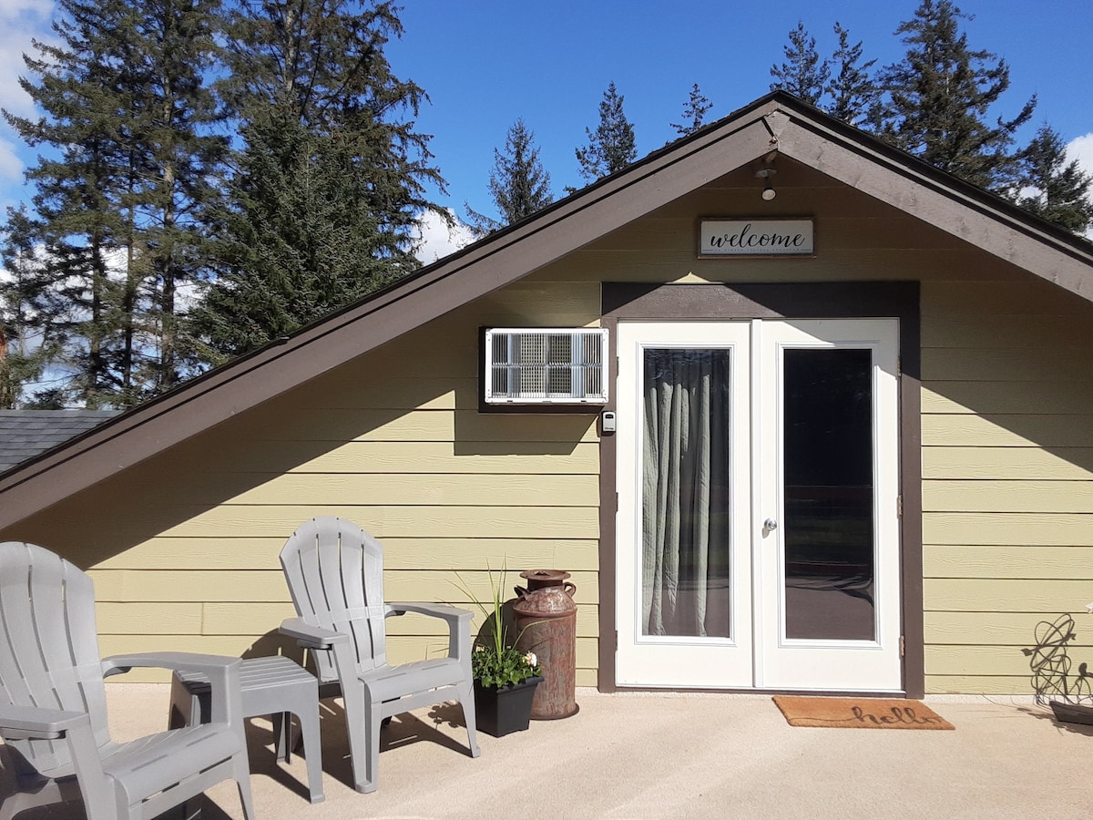 Hidden Pasture Bungalow is located in the countryside of Ferndale; 20 minutes from the heart of Bellingham. We are located on property surrounded by fields & trees. Enjoy your own studio space upstairs above our attached garage with a private entrance & private bathroom. Kitchenette with fridge & microwave, toaster, coffee pot, electric skillet & electric tea kettle; dishes & utensils. TV with DishNetwork. Wifi available. Sit on the balcony and enjoy the view! No pets. Please see house rules.