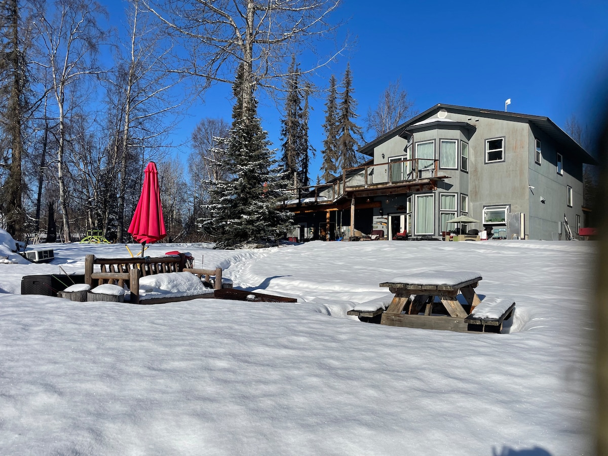 (The lower deck is temporarily closed for repairs but the upper deck and the gazebo are still open). Take it easy at this unique and tranquil getaway. Nestled on 16.7 acres of Alaskan land with access to a private lake. The perfect place to relax after a long day of adventure. (Property is shared with a main house, another cabin, and yurt) but there is plenty of space for privacy. Please please be certain of your booking dates. Cancelling reservations negatively impacts our small business.