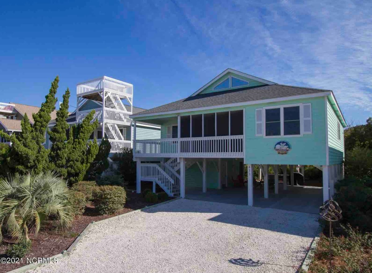 This beach house has everything you could want for your vacation. With 4 bedrooms and a loft, 2 bathrooms and an outdoor shower, and a screened in porch, everyone will be comfortable. It's a short walk to the beach with public access on our street, and one street over to the pier and island shops. Additionally, it is stocked with lots of games, bikes, beach gear and linens/towels, making your packing light. You'll have a great time making wonderful memories!