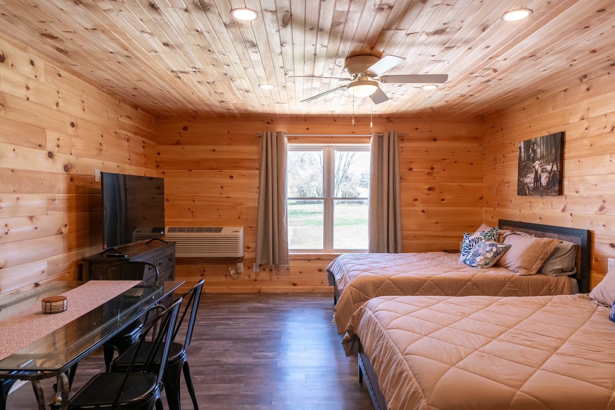 Newly remodeled Log Cabin with new pillows, sheets, towels. Wooded property next to creek. Enjoy screened in front porch or the back deck with 14-foot Swimspa, fire pit & grill in quiet wooded setting. Free State Park pass saves $7 day. Downstairs Master with king bed. 2 queen beds in loft bedroom. Electric fireplace w/5 settings, AC/heat, High speed wifi/internet, SMART TV with Bluetooth sound bar, Direct TV, Washer/dryer. Ice maker. WE ALWAYS OFFER EARLY CHECKIN & CHECKOUTS WHEN AVAILABLE.