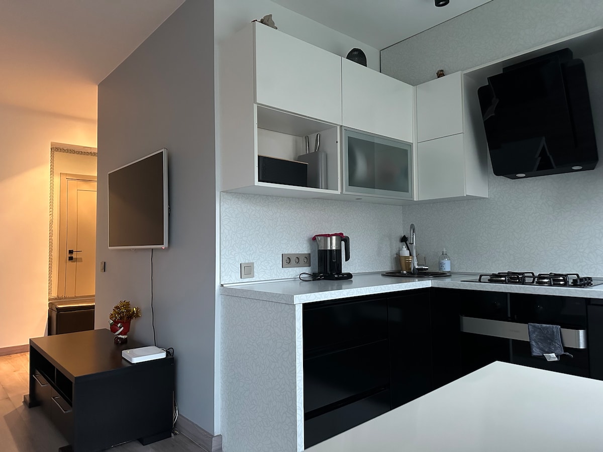 Dziaugiuosi galedama pristatyti Jums atvykus i naujai renovuota jauku apartamenta pacioje Birzu miesto sirdyje.Sis 42kv.m bustas pirmame aukste puikiai tinka keliaujancioms poroms arba nedidelei keturiu asmenu seimai.Cia rasite grazu miegamaji su dvigule lova,svetaineje sofa-lova,pilnai irengta virtuve bei vonios kambari.Privalumas-nemokoma automobiliu stovejimo vieta. Rami ir kartu patogi vieta randasi salia prekybos centro,nedideliu vietiniu krautuveliu,kavinukiu ir lankytinu turistiniu vietu.